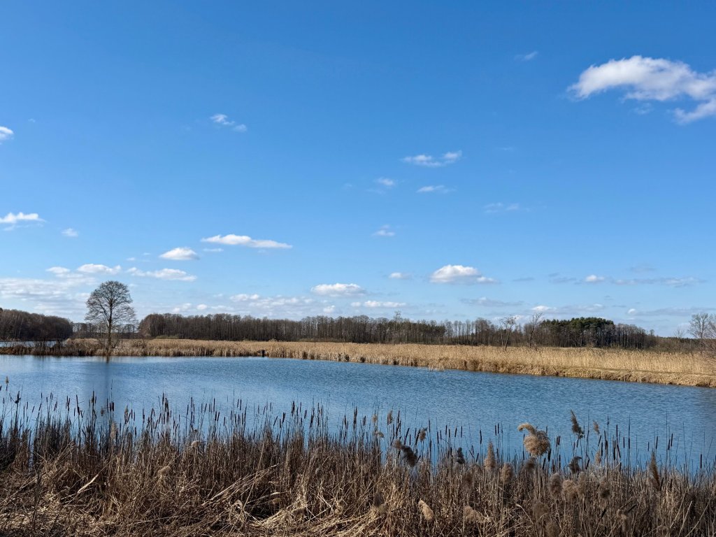 To stawy rybne, wszystko wygląda na uporządkowane, ale jednocześnie nadal spokojne i naturalne. Nad wodą krążą kaczki. Słychać ich ruch, plusk, czasem przelot nisko nad taflą. Po całej tej ścieżce to miejsce daje dokładnie to, czego trochę brakowało wcześniej.