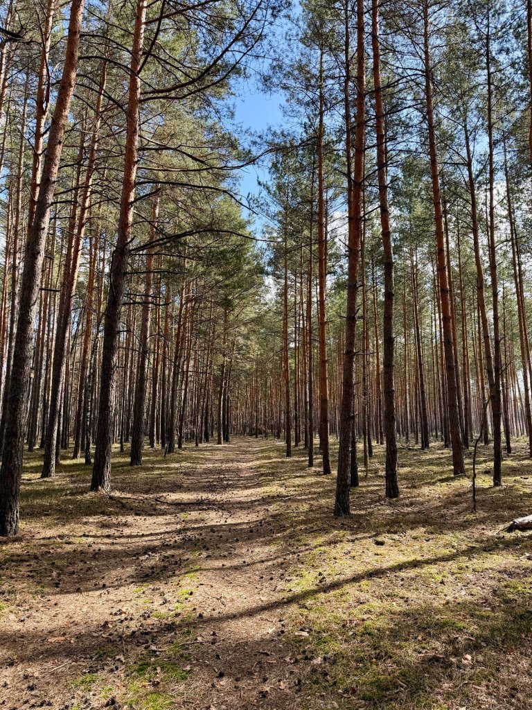 Oznaczenia ścieżki są, ale momentami już starte, mniej czytelne. Trzeba trochę bardziej ufać intuicji niż znakom. Droga znów się poszerza. Szeroka, leśna, zasypana szyszkami. Wysokie sosny rosną równo, tworząc coś w rodzaju naturalnych kolumn. Idziemy między nimi, a światło i cień układają się na ziemi w długie, spokojne pasy.