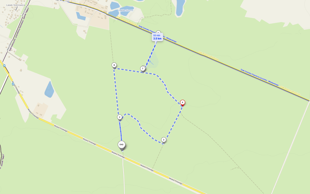 Parking – Z parkingu kierujemy się zgodnie z strzałkami droga w głąb lasu – Na pierwszym skrzyżowaniu skręcamy w prawo – Poruszamy się cały czas zgodnie z strzałki – Ścieżka tworzy kształt „U” i przy jego drugim ramieniu należy skręcić w prawo w stronę bagna (w tym miejscu znak jest trochę mylący) – Po dojściu do tabliczki za bagnem zawracamy i na skrzyżowaniu skręcamy w prawo – Na następnym skrzyżowaniu skręcamy w lewo i idziemy dalej prosto aż do parkingu – Parking