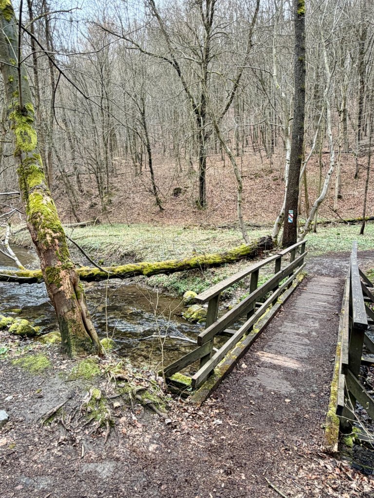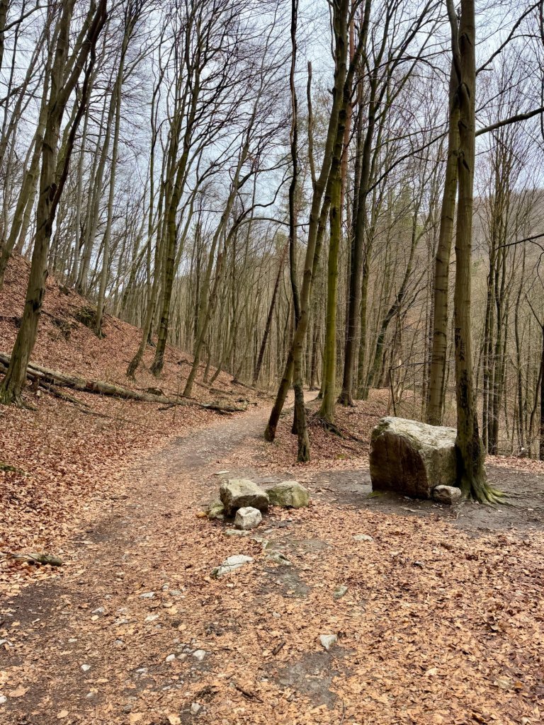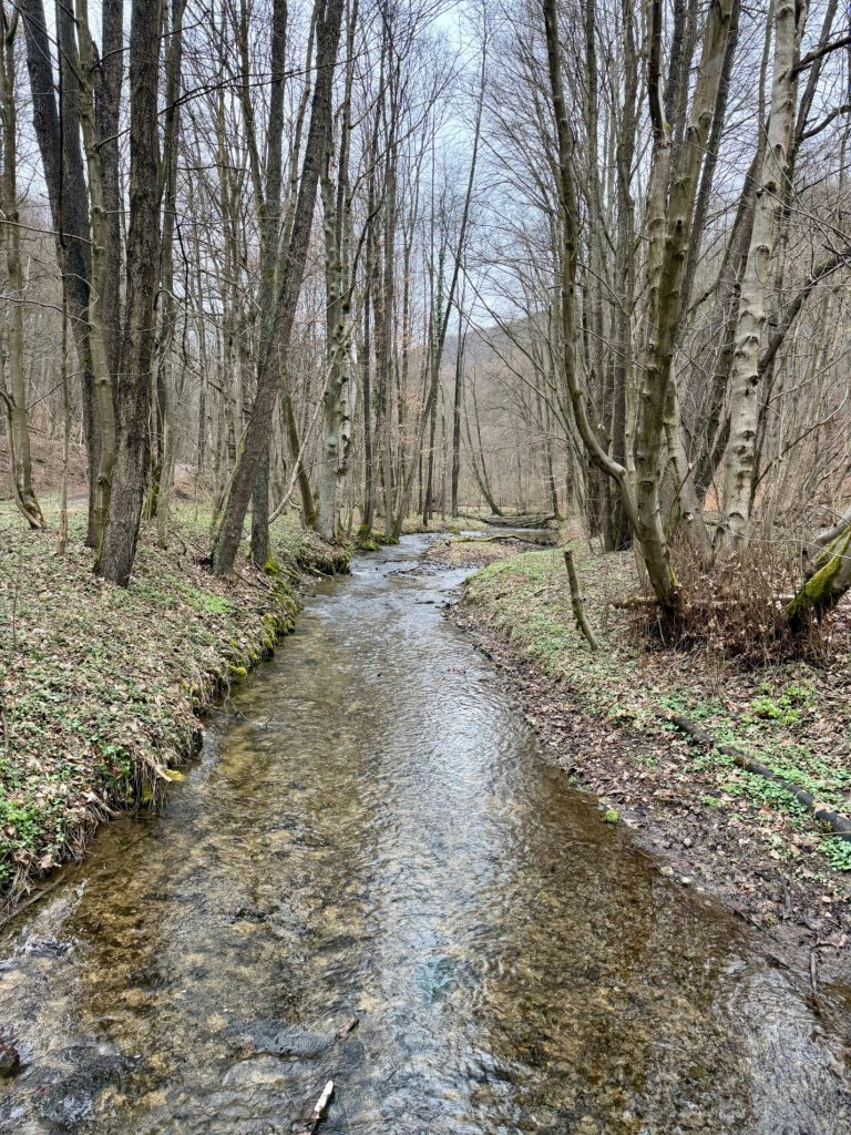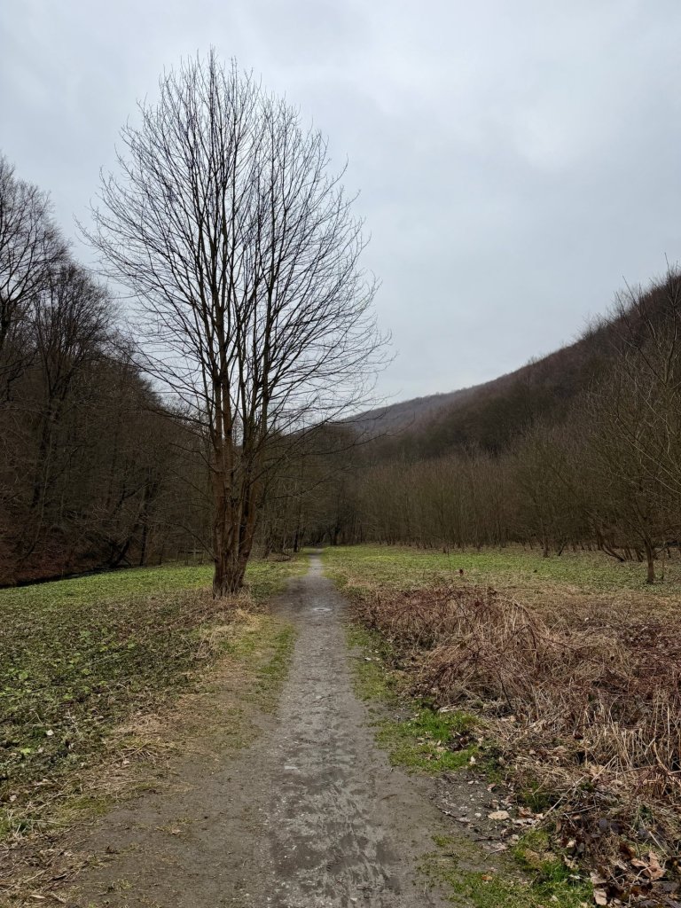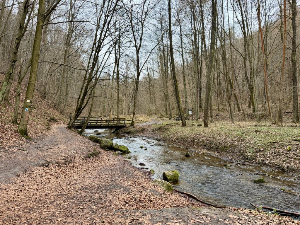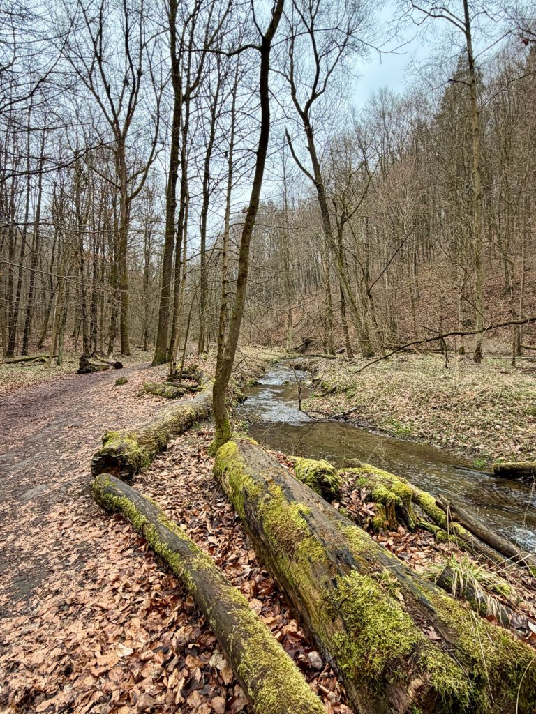 Idziemy dalej, a ścieżka prowadzi nas coraz głębiej w dolinę. Las jest jeszcze bez liści, więc wszystko wydaje się bardziej otwarte, widać więcej, dalej, szerzej. I trochę bardziej surowo.