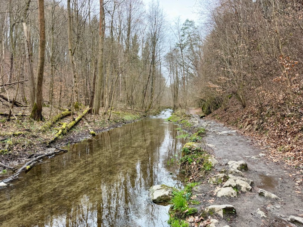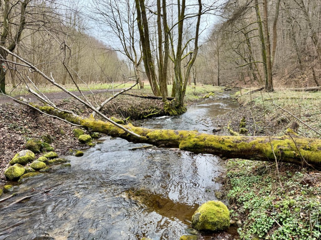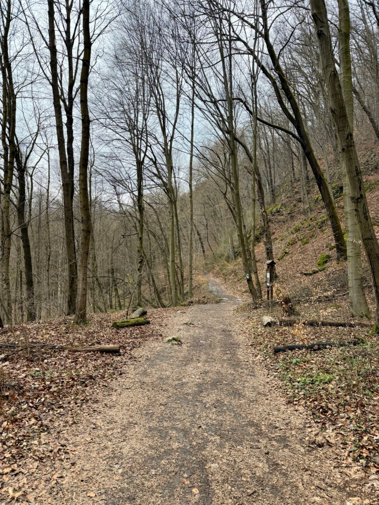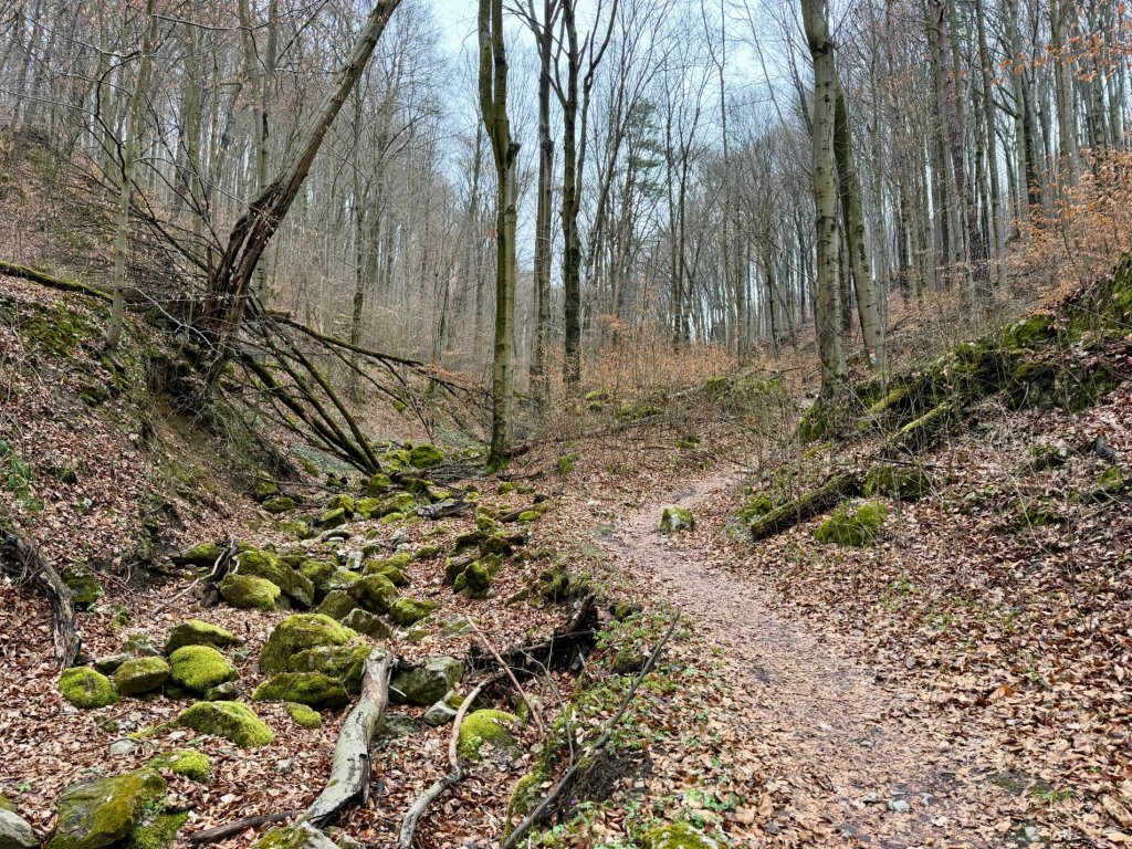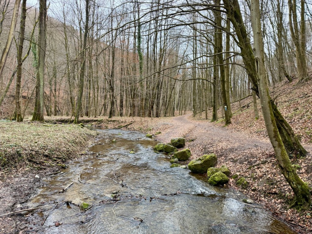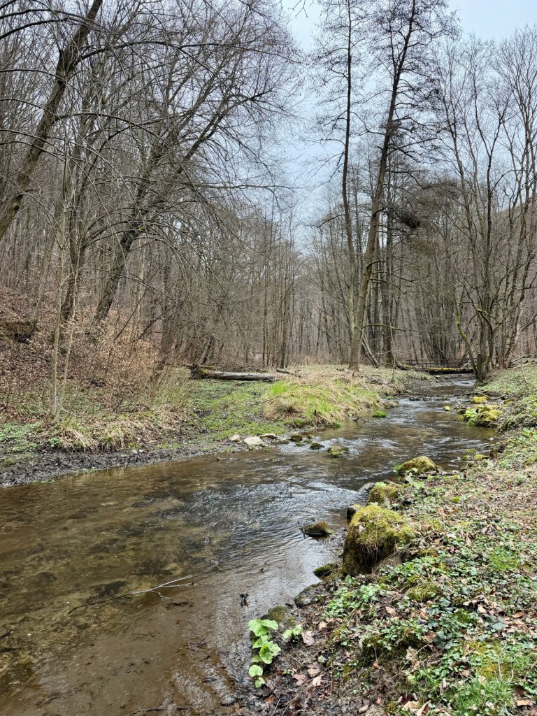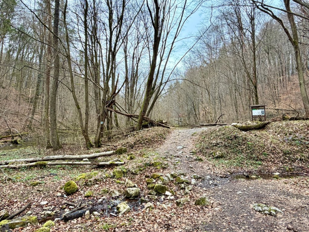 Idziemy dalej, a ścieżka prowadzi nas coraz głębiej w dolinę. Las jest jeszcze bez liści, więc wszystko wydaje się bardziej otwarte, widać więcej, dalej, szerzej. I trochę bardziej surowo.