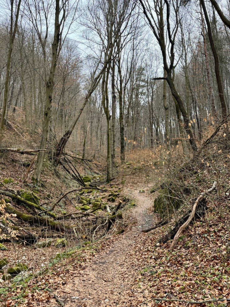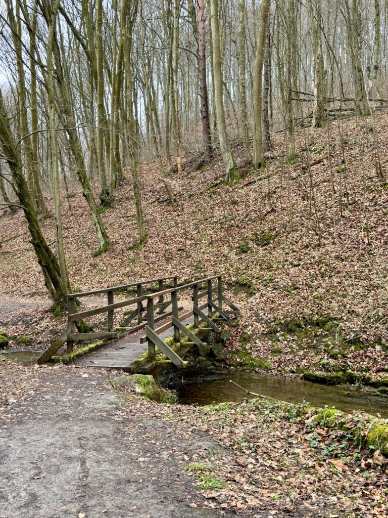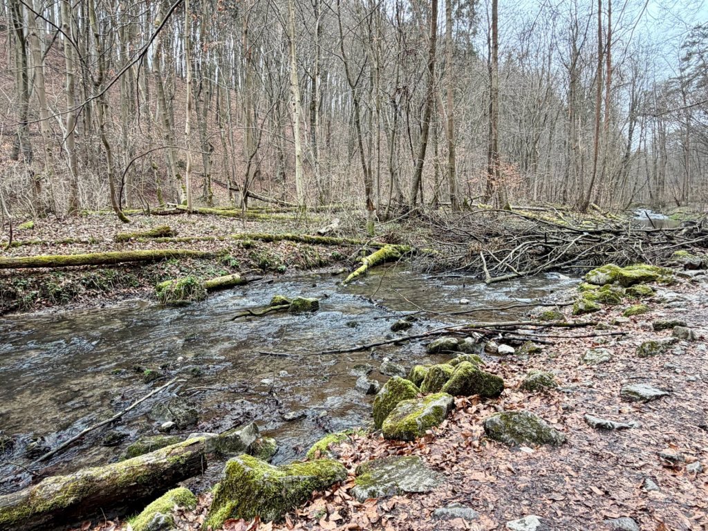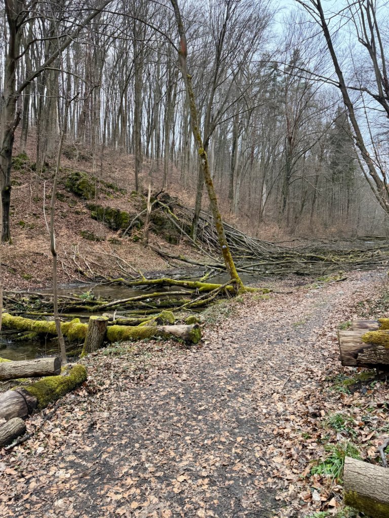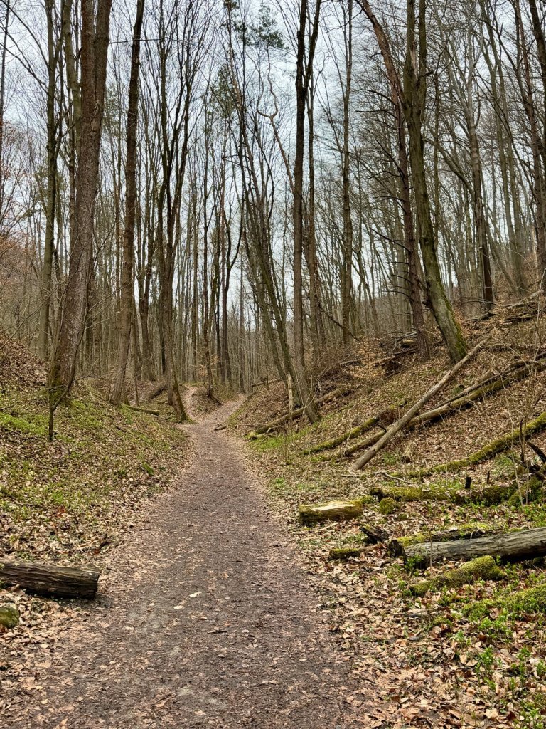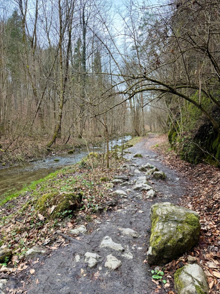 Idziemy dalej, a ścieżka prowadzi nas coraz głębiej w dolinę. Las jest jeszcze bez liści, więc wszystko wydaje się bardziej otwarte, widać więcej, dalej, szerzej. I trochę bardziej surowo.