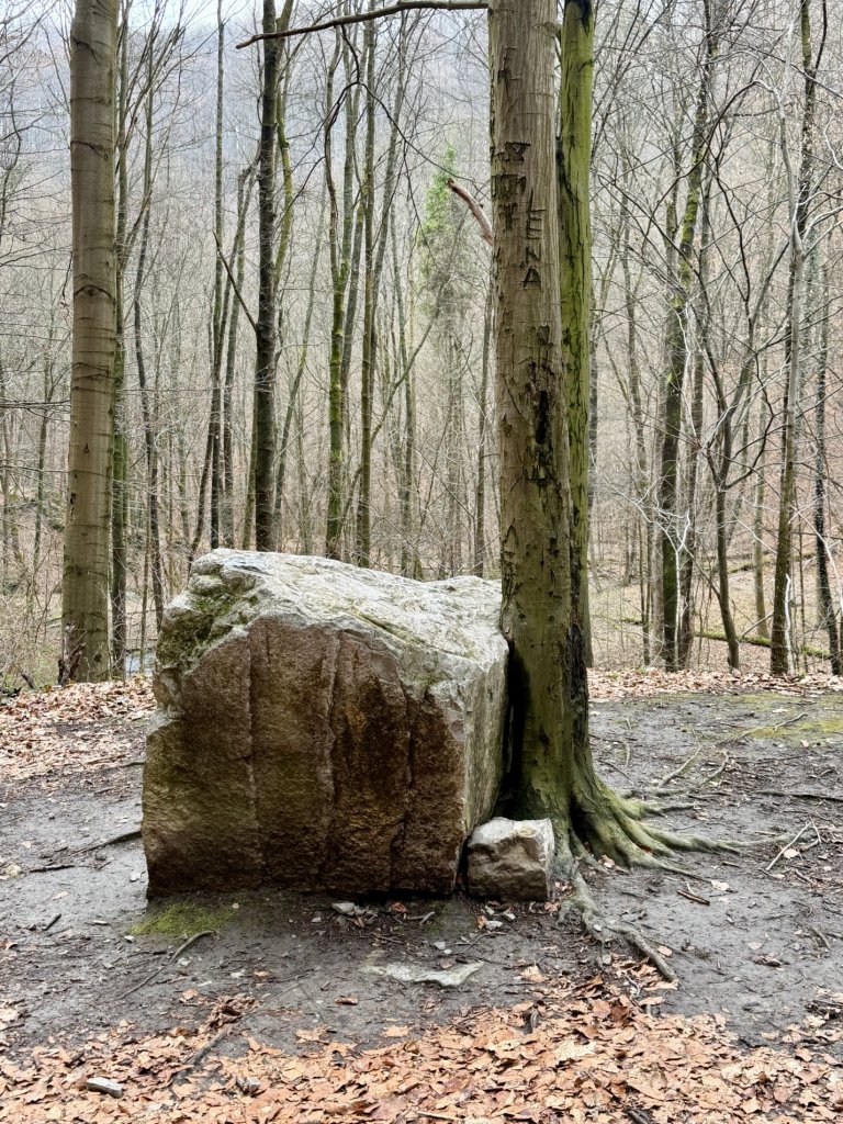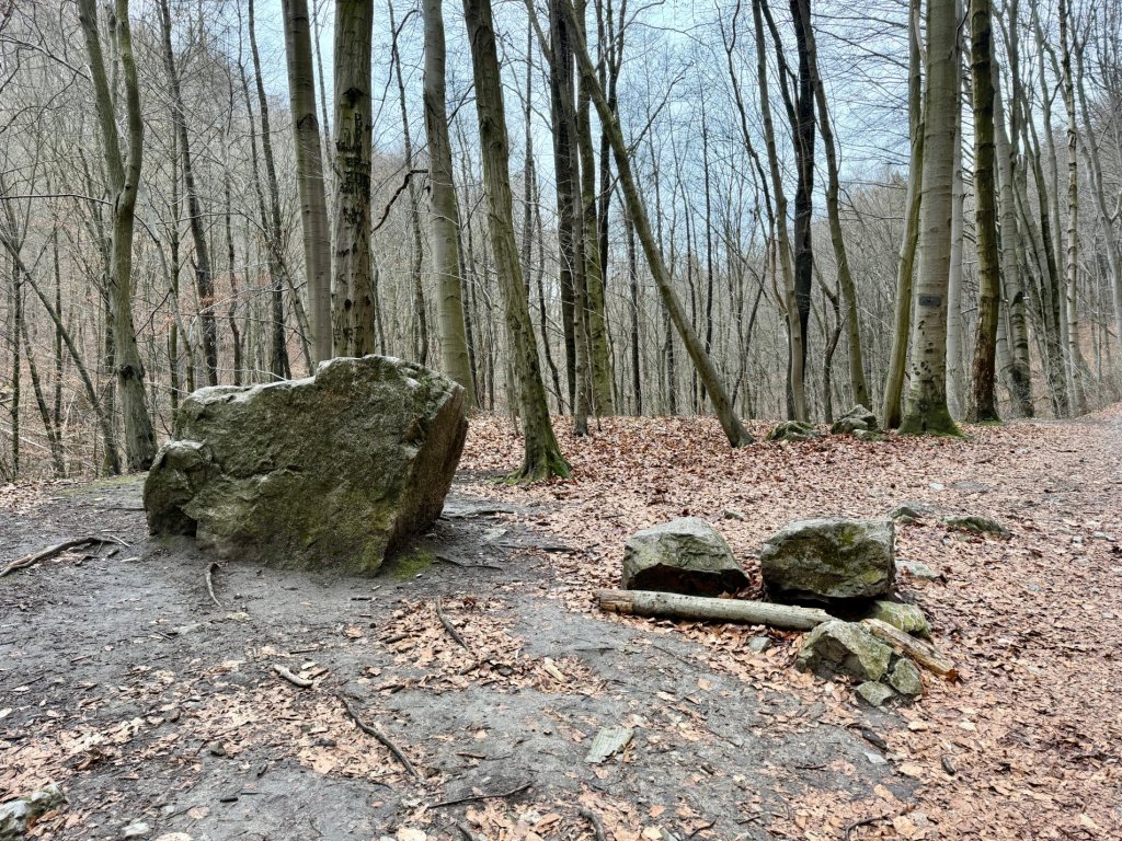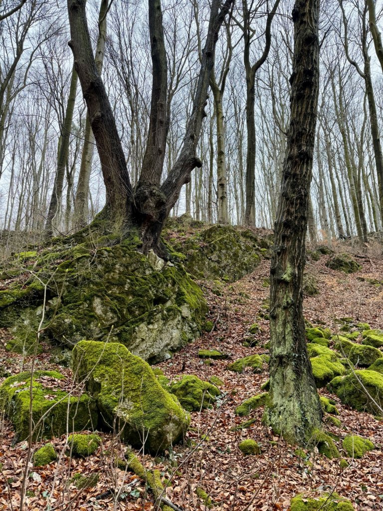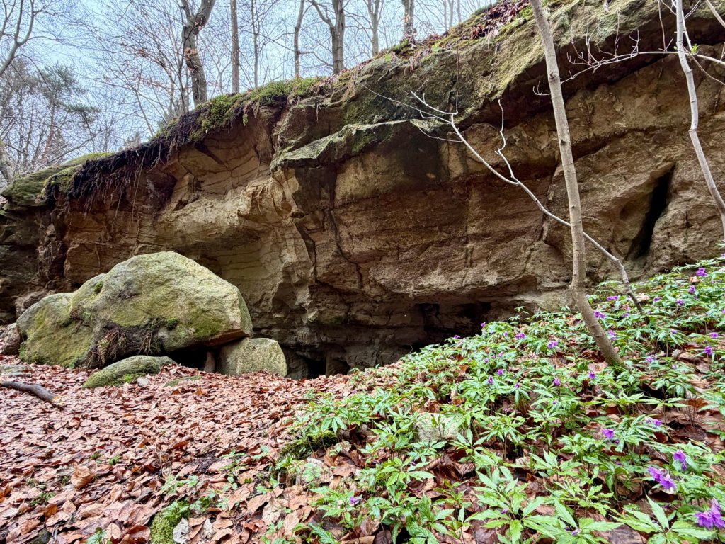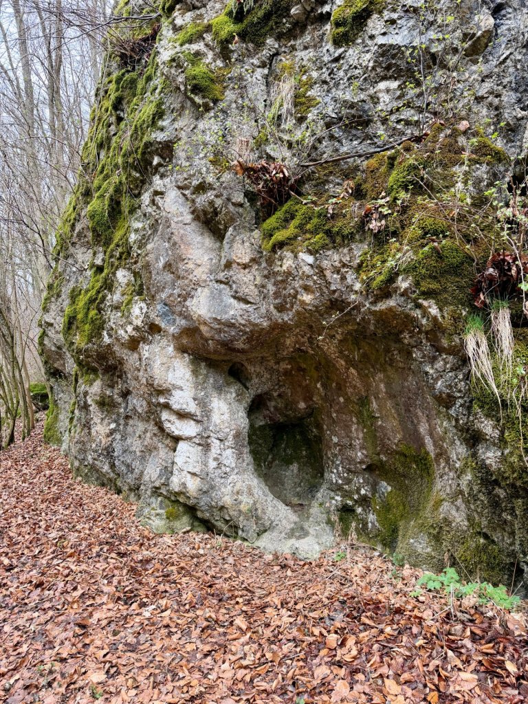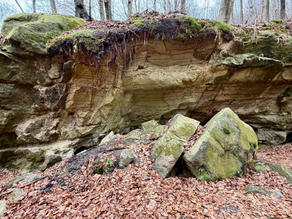 Kilka kroków pomiędzy drzewami i nagle pojawia się ona, skalna formacja. Surowa, warstwowa, miejscami podcięta, z niewielkimi otworami u podstawy. Nad nią cienka warstwa mchu i liści, a wyżej spokojny, bukowy las. Wszystko wygląda, jakby ktoś odsłonił fragment wnętrza tej doliny.