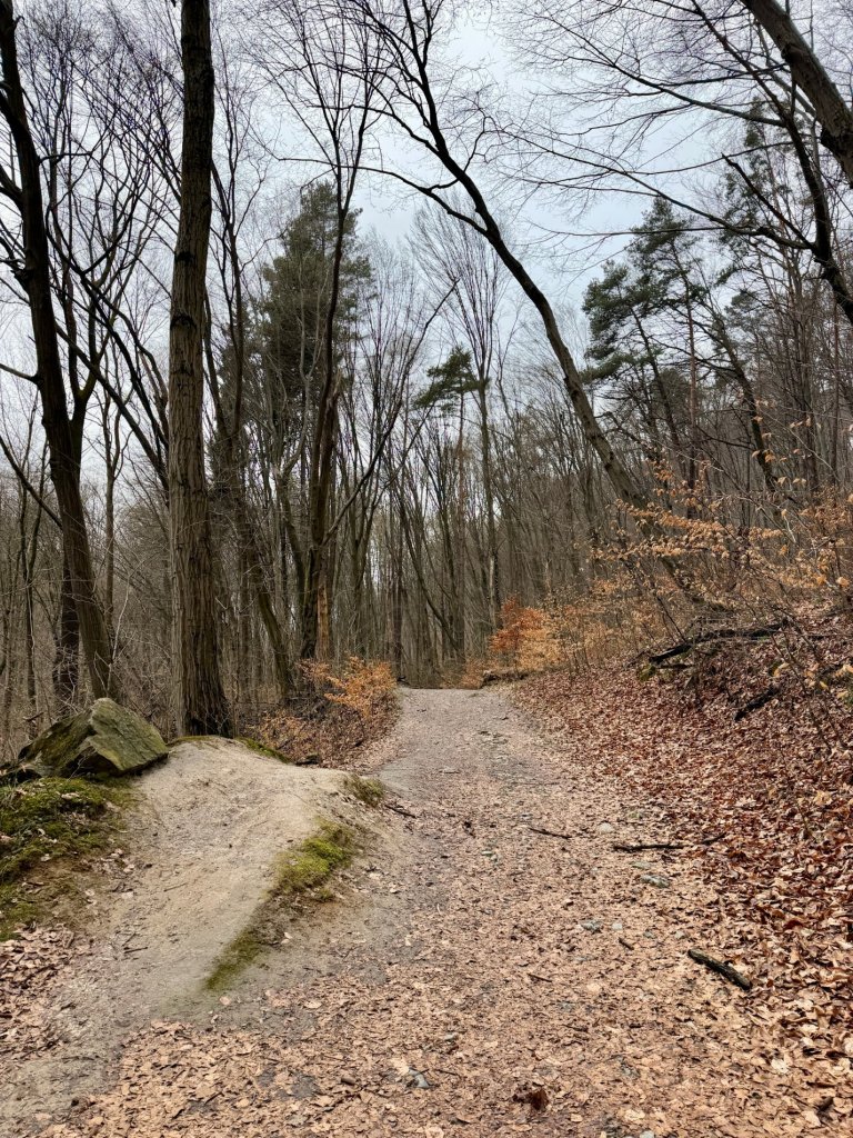 Z drugiej strony co jakiś czas pojawiają się fragmenty, które przypominają, że to jednak teren naturalny, a nie parkowa alejka. Podejścia robią się bardziej strome, ścieżka węższa i mniej przewidywalna, liście potrafią być śliskie, a korzenie i kamienie wymagają uwagi. Trzeba zwolnić, złapać oddech, czasem się zatrzymać. To nie jest trudna trasa, ale na pewno nie jest też całkowicie „bez wysiłku”.