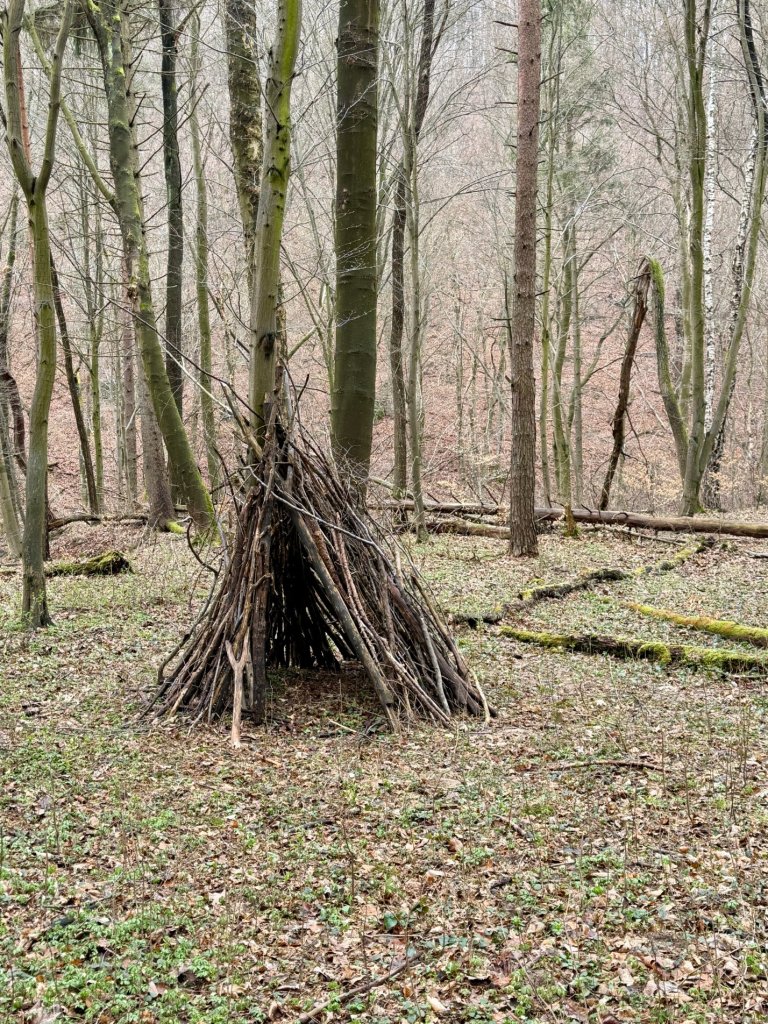 Gdzieś po drodze trafiliśmy też na niewielki szałas z gałęzi, prosty, trochę dziki, jakby ktoś zostawił go tu tylko na chwilę. Pasował idealnie do tego miejsca.