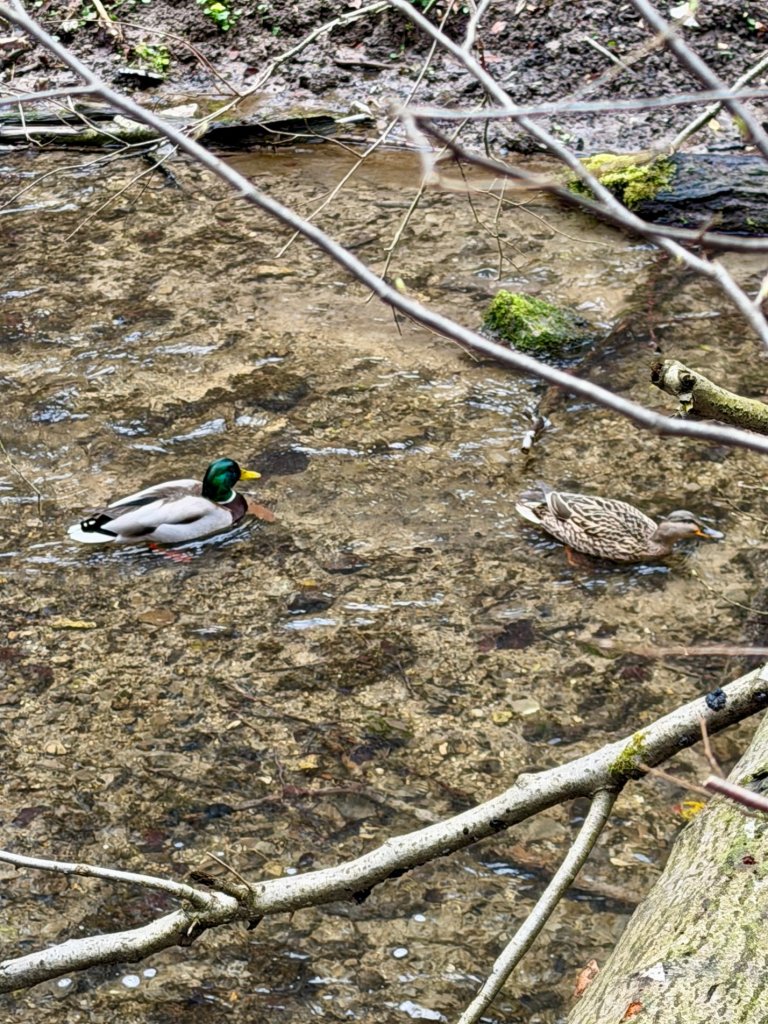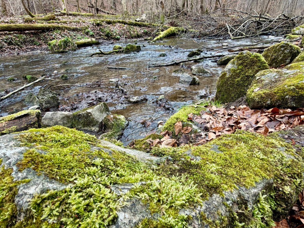 Przechodzimy przez mostek. Drewniany, lekko omszały, z poręczami, które mają już swój wiek. Drewno jest ciemniejsze od wilgoci, trochę śliskie, trochę chłodne w dotyku. Pod spodem woda płynie spokojnie, odbijając się od kamieni. A kamienie… są niemal zielone. Pokryte mchem, miękkim, wilgotnym, takim który aż chce się dotknąć. Leżą wzdłuż brzegu, w wodzie, przy ścieżce. Wprowadzają trochę koloru w tę całą szarość. I nagle okazuje się, że ten „brak wiosny” wcale nie jest taki pusty. Po prostu trzeba się trochę bardziej zatrzymać, żeby go zobaczyć.