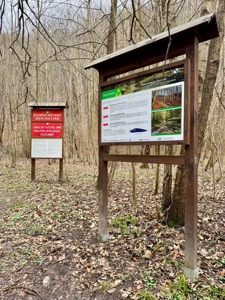 Po chwili pojawia się kolejna tabliczka. Tym razem bardziej „porządkująca” to, gdzie właściwie jesteśmy. Dowiadujemy się, że Dolina Racławki to nie tylko zwykły teren spacerowy, ale miejsce objęte kilkoma formami ochrony jednocześnie. Jesteśmy w Parku Krajobrazowym Dolinki Krakowskie, ale jednocześnie w rezerwacie przyrody Dolina Racławki, a do tego w obszarze Natura 2000. Brzmi poważnie, ale w praktyce oznacza jedno: to miejsce jest naprawdę istotne.