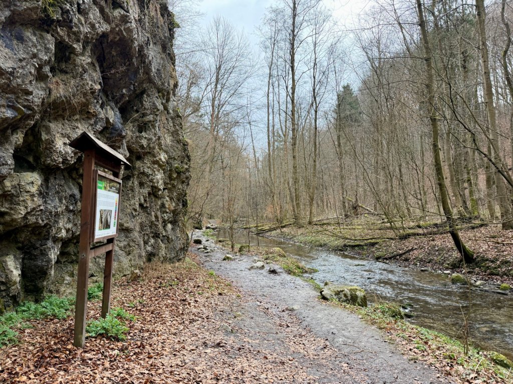 Po drodze mijamy kilka ławeczek. Puste. Trochę wilgotne, trochę chłodne, ale ustawione w takich miejscach, że aż chce się tu wrócić, kiedy będzie cieplej. Teraz tylko zwalniamy na chwilę, patrzymy na dolinę i idziemy dalej. Ścieżka prowadzi nas wciąż dołem, blisko rzeki, ale teren zaczyna delikatnie się podnosić. I w pewnym momencie zaczyna się podejście. Niewielkie, ale po tej całej spokojnej wędrówce od razu je czuć. Zmieniamy tempo. Oddech robi się trochę głębszy. Kroki trochę cięższe.