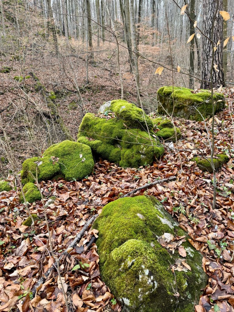 Z boku ścieżki zaczyna się niewielkie rozcięcie terenu, coś pomiędzy suchym korytem a leśnym rowem. Kamienie są porozrzucane nieregularnie, jakby ktoś je kiedyś puścił z góry i już tak zostały. W wielu miejscach pokrywa je miękki, intensywnie zielony mech.