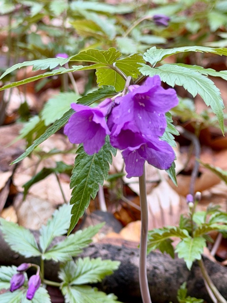 Tuż pod skałą, między mokrymi liśćmi, pojawiają się pierwsze kolory. Niskie, delikatne rośliny z intensywnie fioletowymi kwiatami, jakby ktoś rozsypał je dokładnie wzdłuż ścieżki.