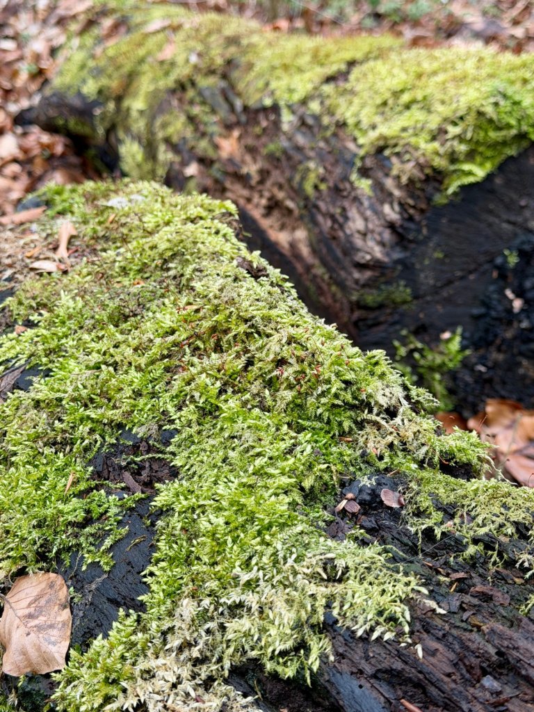 Obok ścieżki pojawiają się omszałe formacje skalne. Niewielkie, ale bardzo wyraźne, zielone, miękkie w wyglądzie, jakby ktoś rozłożył na kamieniach cienką warstwę mchu. Ten kolor zaczyna dominować nad szarością i brązem. Wokół coraz więcej powalonych drzew. Niektóre leżą wzdłuż rzeki, inne przewrócone są przez ścieżkę albo oparte o sąsiednie pnie. Część z nich już zaczyna się rozkładać, pojawiają się grzyby, miękka struktura drewna, ślady życia, które wraca do lasu w innej formie.