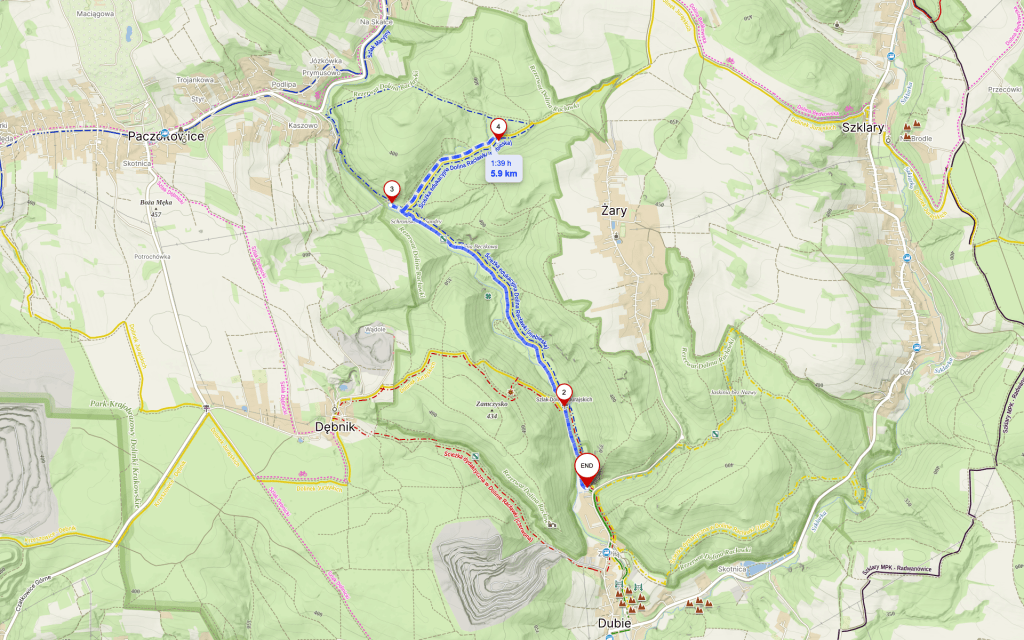 Trasa: Parking – Kierujemy się zgodnie z oznaczeniami szlaku niebieskiego – Początkowy odcinek jest dosyć szeroki o dobrze zadbany, ale po około 1km ścieżka robi się węższa i bardziej nierówna – Na wysokości tabliczki numer 10 skręcamy w prawo i idziemy pod górę – Po dojściu do tabliczki numer 13 (jest jakieś 30m na prawo od szlaku, więc trzeba uważać żeby jej nie pominąć) zawracamy – Wracamy tą samą drogą do parkingu – Parking