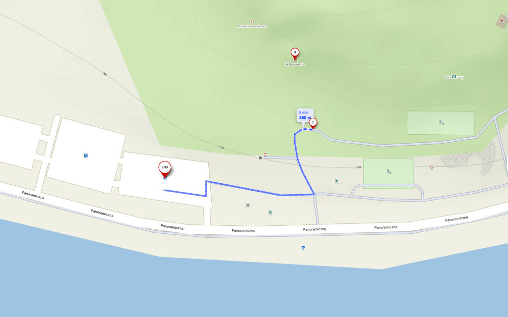 Trasa: Parking – Kierujemy się w stronę parku linowego – skręcamy w lewo za wiatą turystyczną – Docieramy do podnórza formacji skalnych – W lewo wiedzie ścieżka, którą można przejść około 100m żeby zobaczyć pozostałe skały – Wracamy tą samą drogą do parkingu- Warto przejść na drugą stronę drogi asfaltowej na niewielkie molo i plażę.