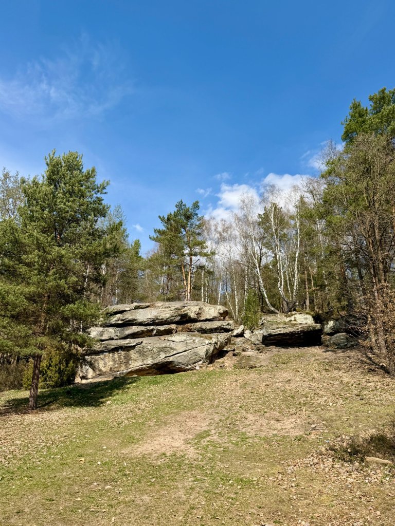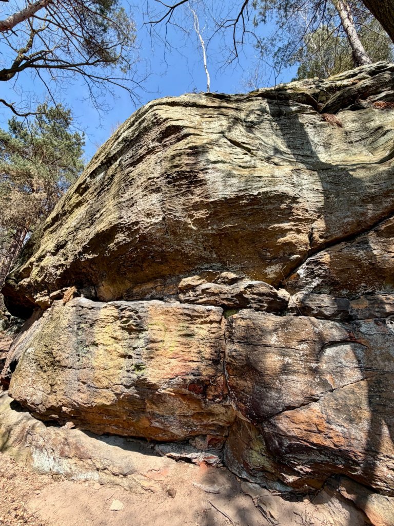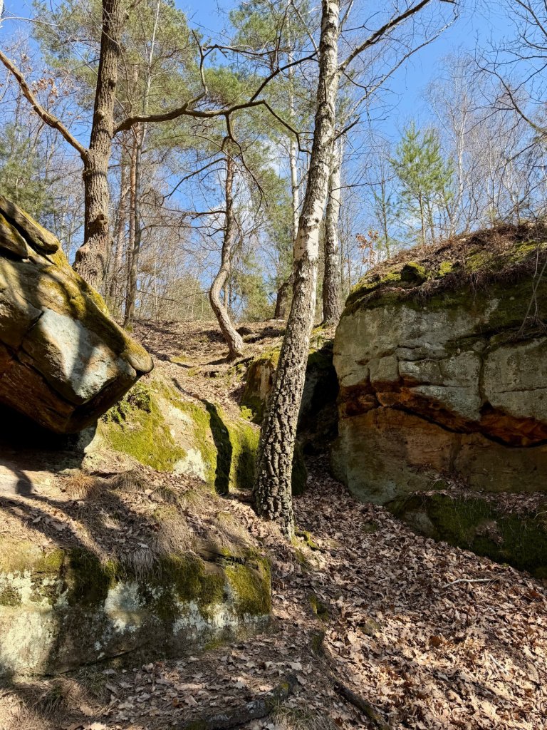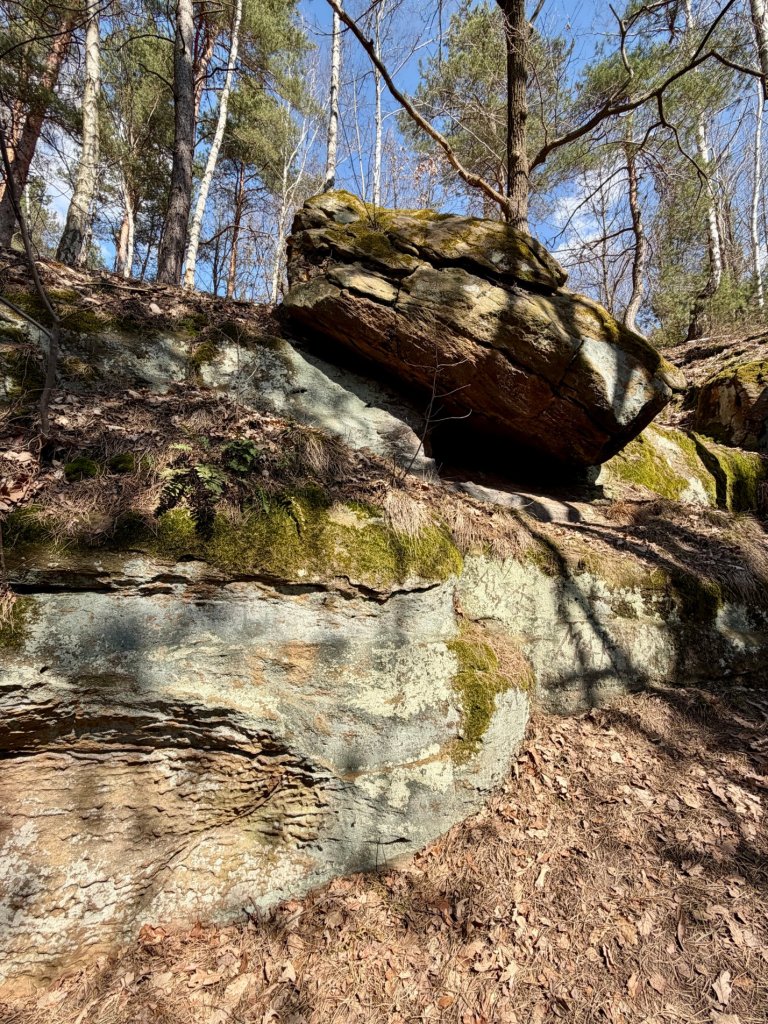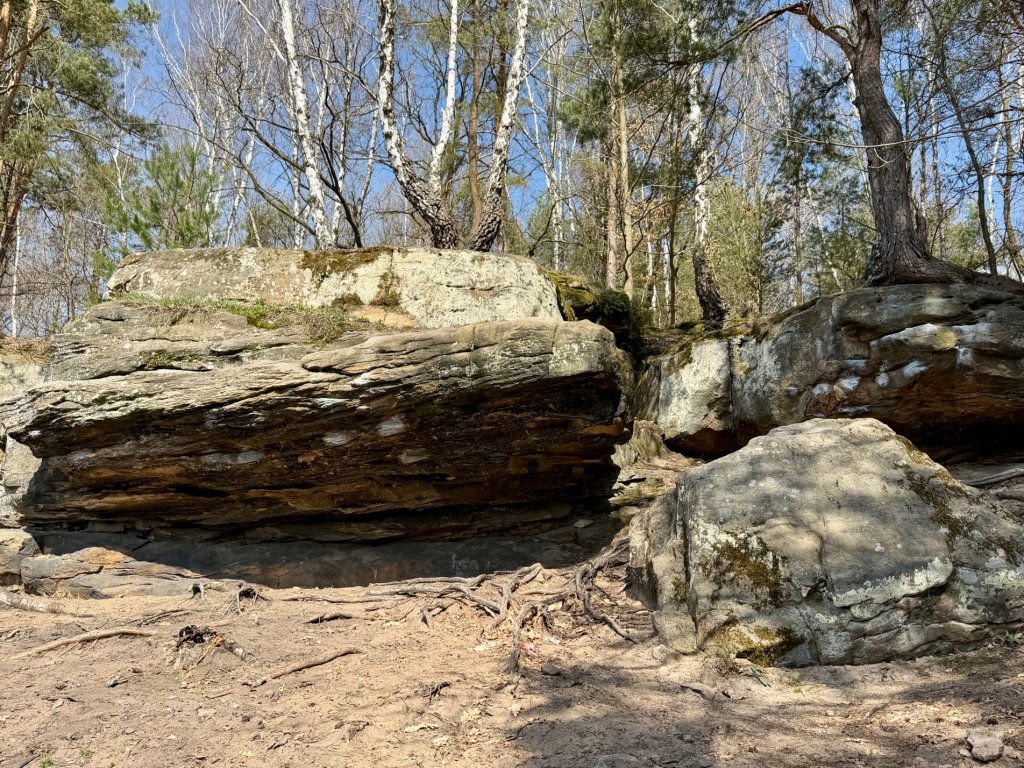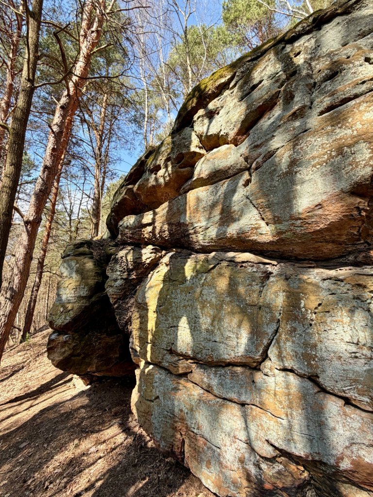Z rekreacyjnej, otwartej przestrzeni przechodzimy w bardziej surowy, leśny klimat. I właśnie tam trafiamy na skały. Formacje są nieregularne, momentami jakby pofalowane i „porwane”, z wyraźną strukturą, którą widać nawet z daleka.