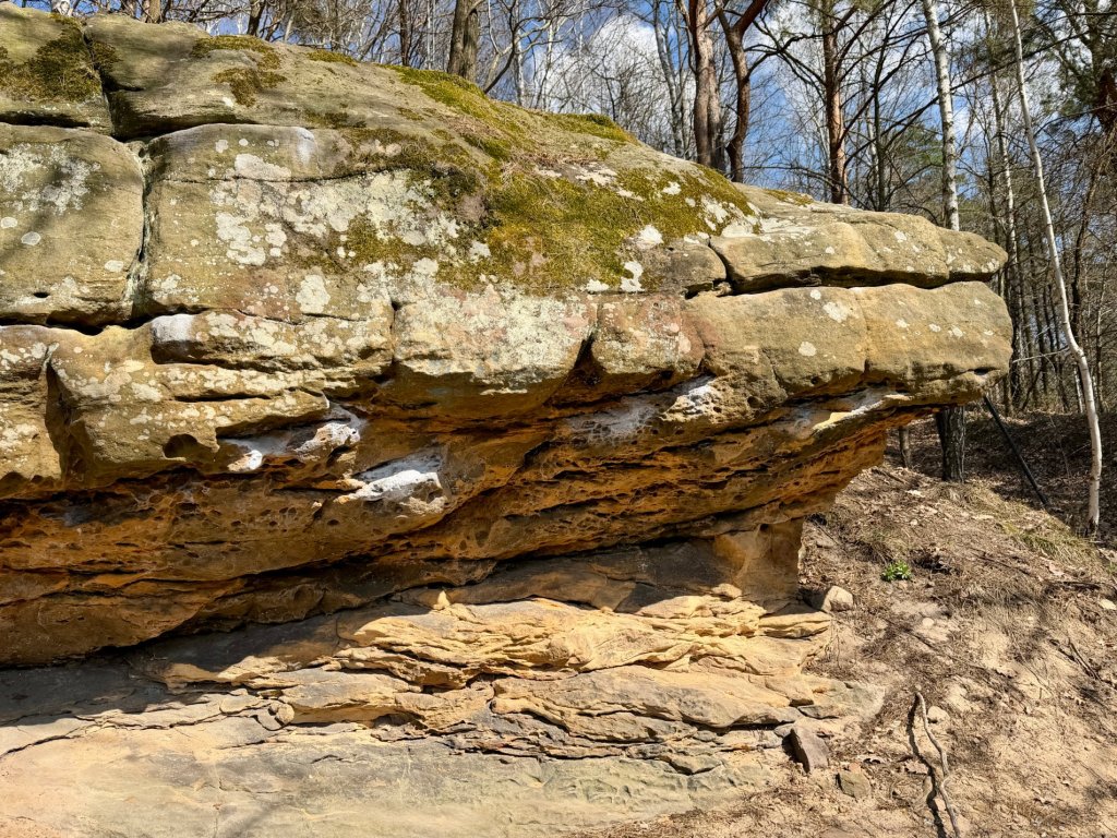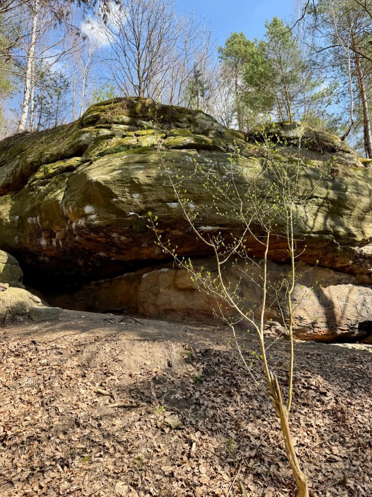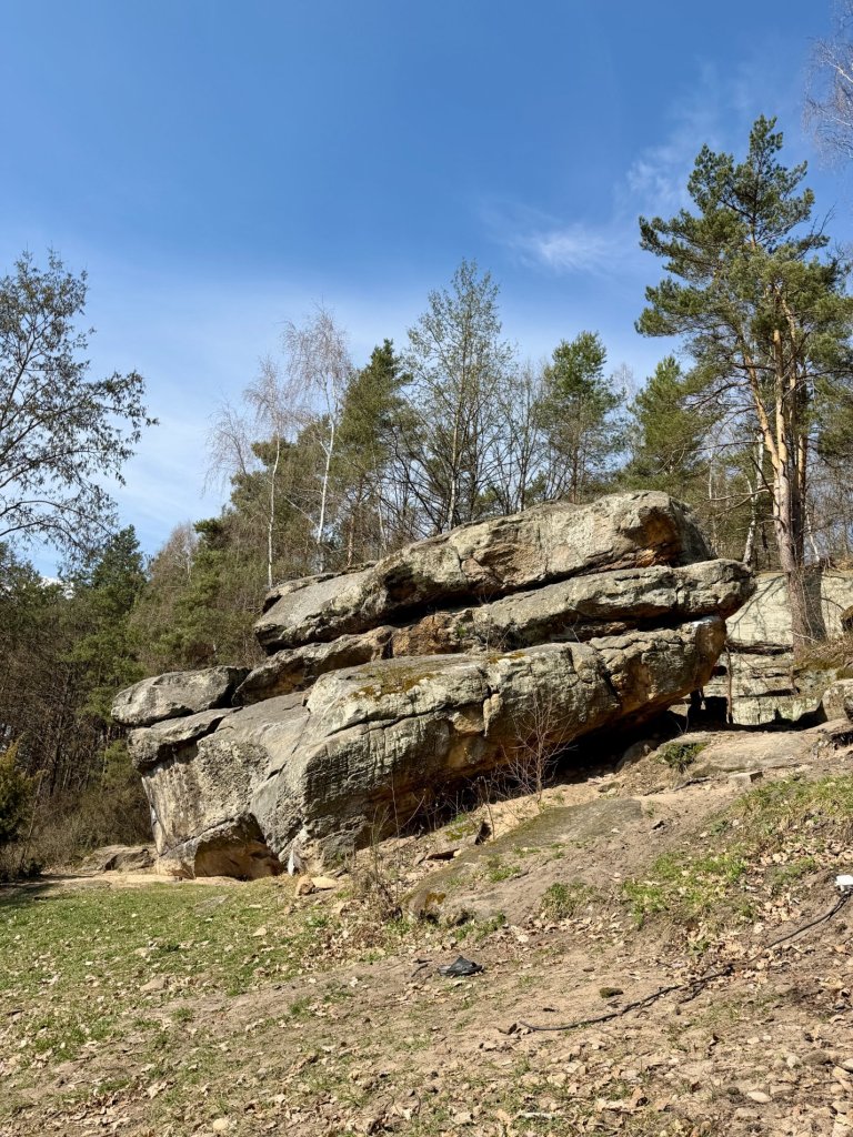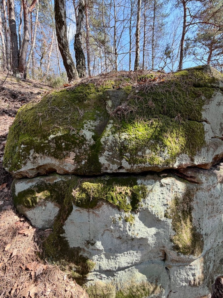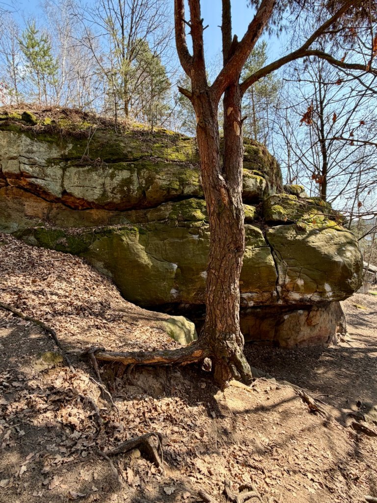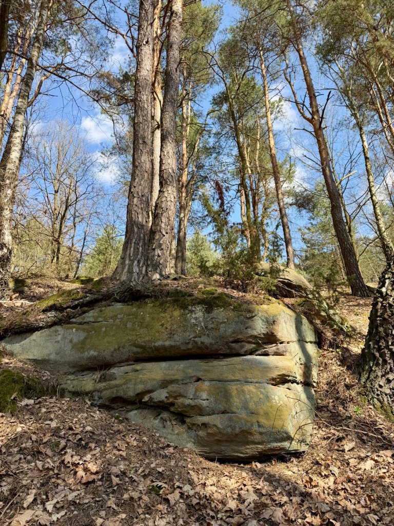 Z rekreacyjnej, otwartej przestrzeni przechodzimy w bardziej surowy, leśny klimat. I właśnie tam trafiamy na skały. Formacje są nieregularne, momentami jakby pofalowane i „porwane”, z wyraźną strukturą, którą widać nawet z daleka.