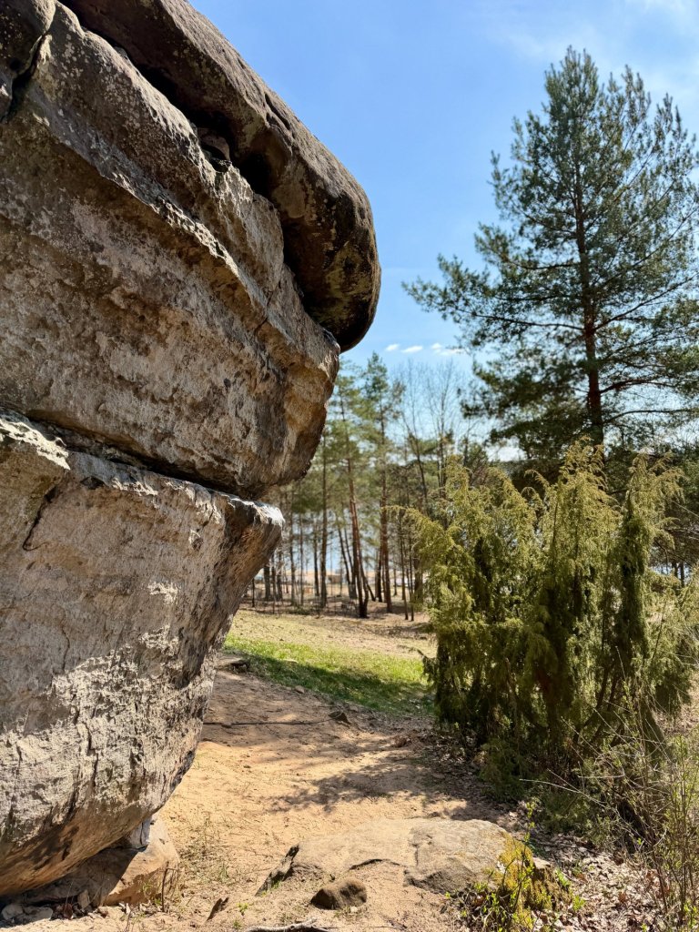 Z bliska robią jeszcze większe wrażenie, powierzchnia jest chropowata, miejscami jakby wydrążona, z naturalnymi zagłębieniami i pęknięciami. Trochę przypominają te pod Niekłaniem, czy pod Adamowem, choć tutaj klimat jest bardziej surowy. W Krynkach widzieliśmy podobne formacje, ale tam las był zupełnie inny, bardziej zielony i „żywy”.