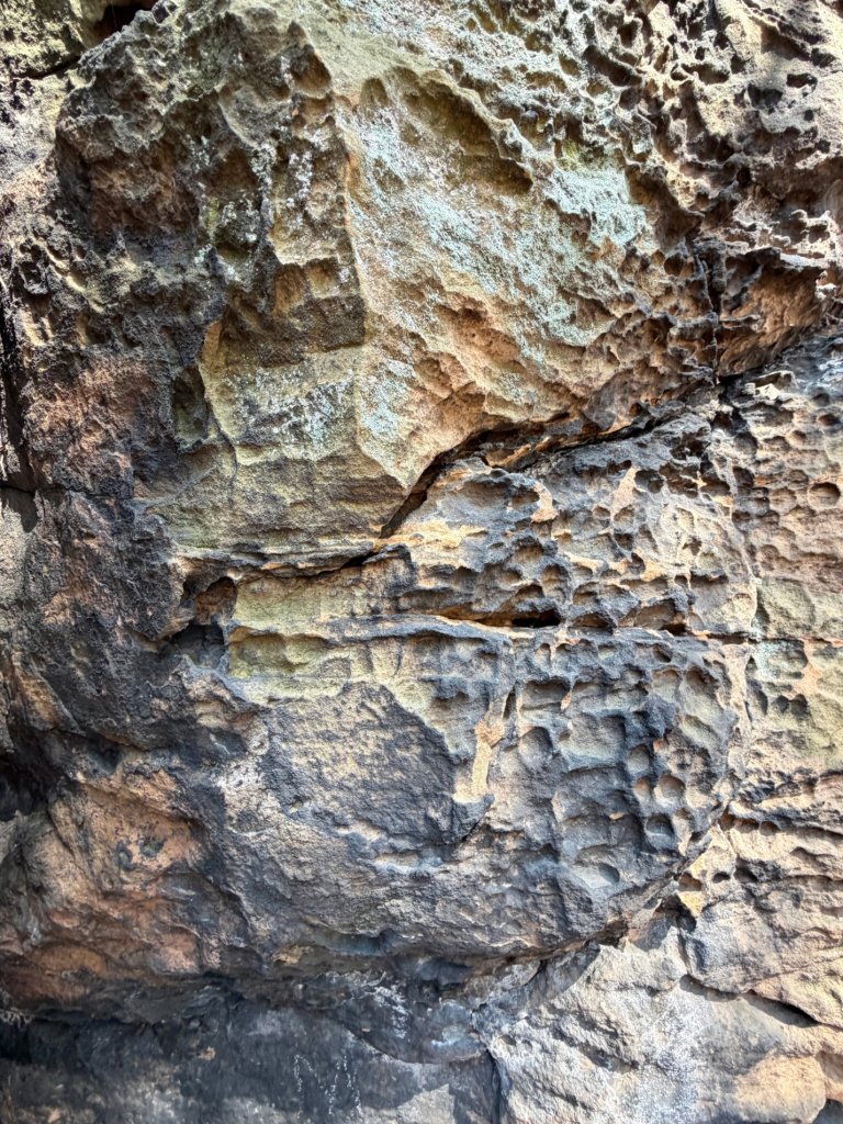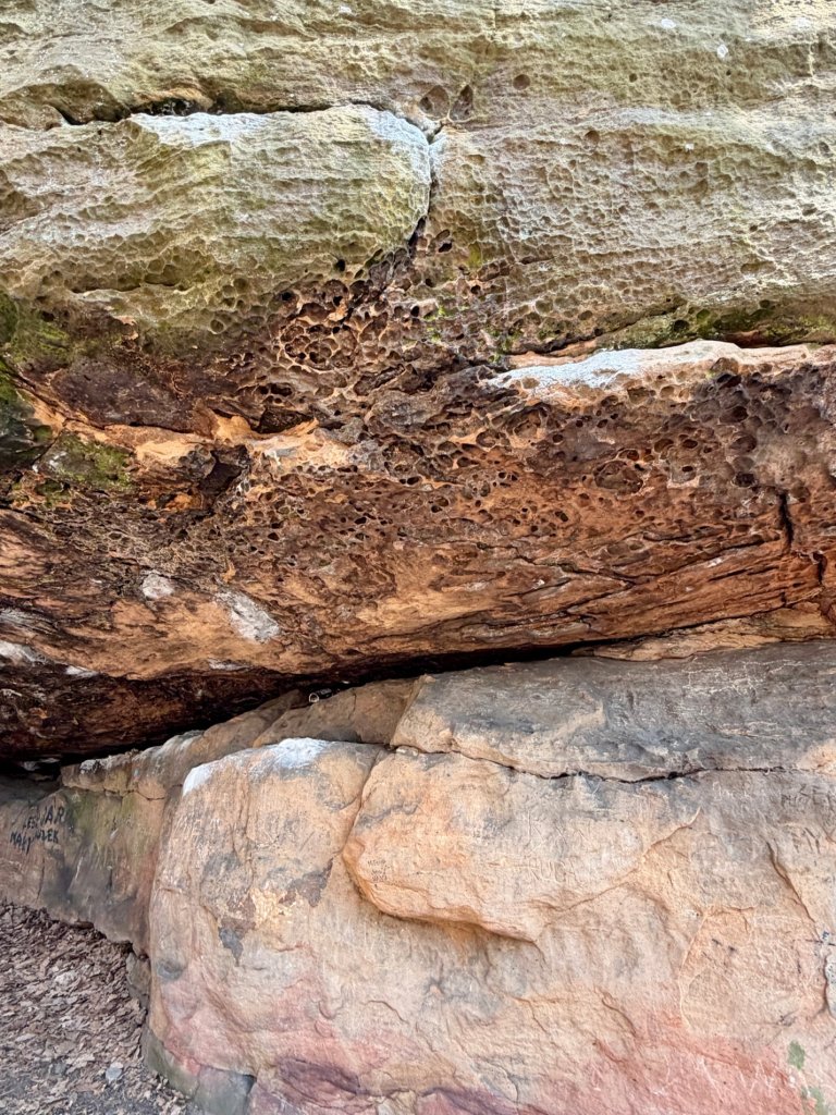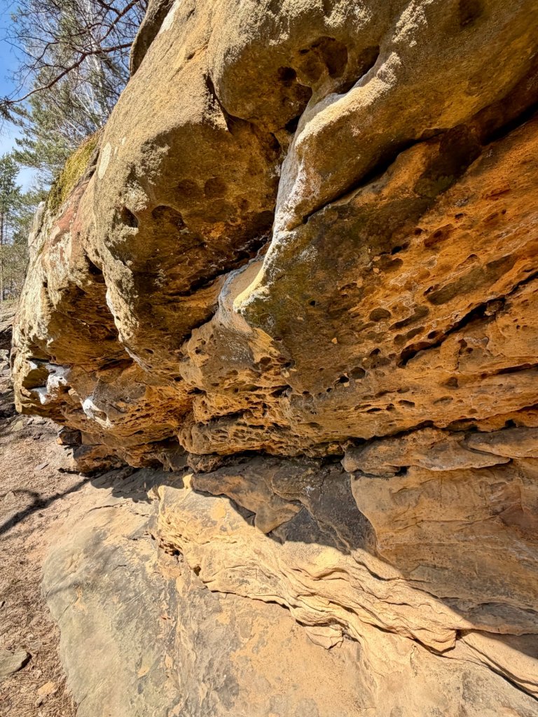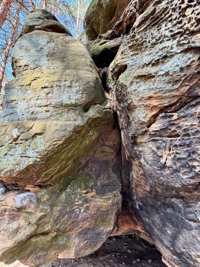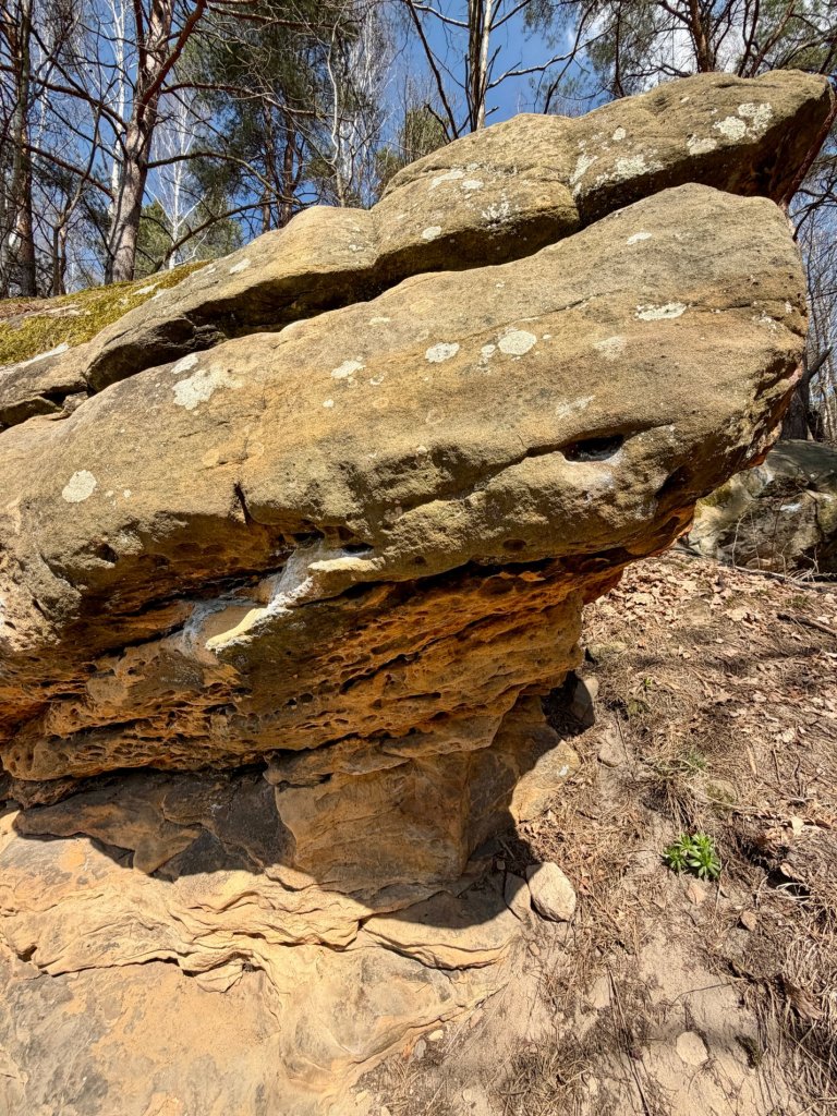 Można podejść bardzo blisko, obejść skały dookoła, zajrzeć pod nawisy i przyjrzeć się strukturze z bliska. Szczególnie ciekawe są fragmenty o nieregularnej, „wydrążonej” powierzchni, które aż zachęcają, żeby je oglądać z każdej strony.