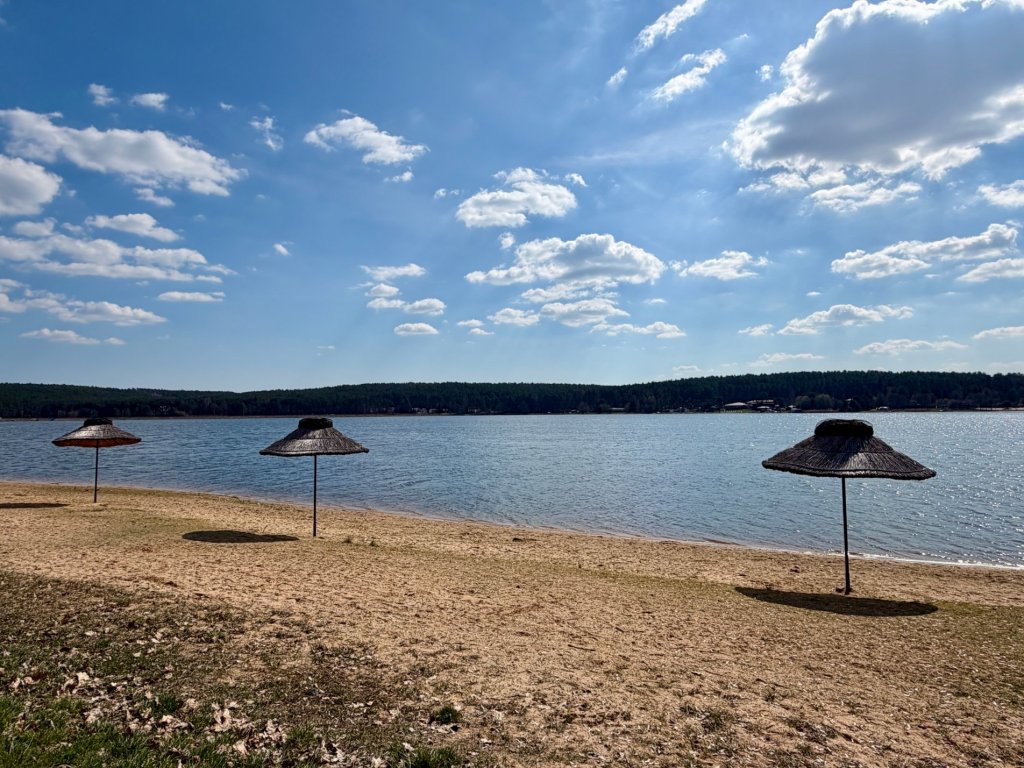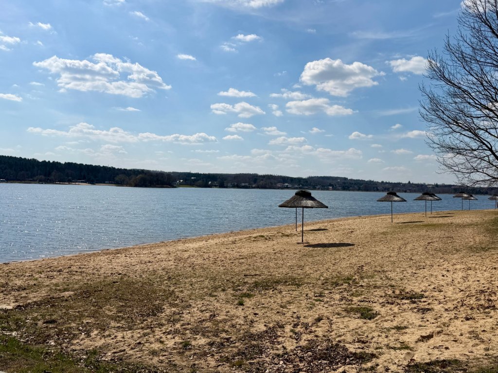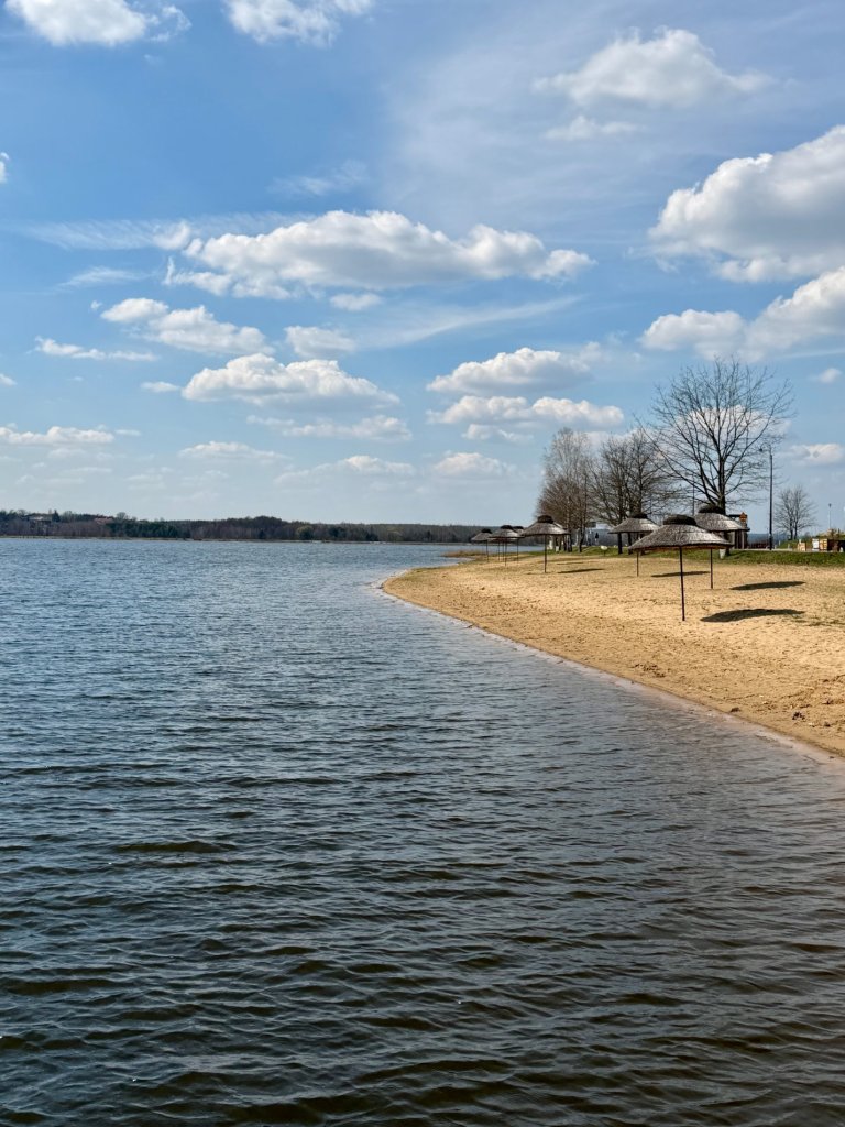 Schodzimy niżej na spacer przy Zalewie Brody, gdzie od razu widać, że to miejsce stworzone raczej pod letni wypoczynek. Plaża, równe rzędy parasoli z trzciny, ławki i szeroka ścieżka wzdłuż wody, wszystko gotowe na sezon, choć teraz jest jeszcze spokojnie. Spacerowiczów trochę jest, ale zdecydowanie mniej niż można by się spodziewać w takim miejscu.