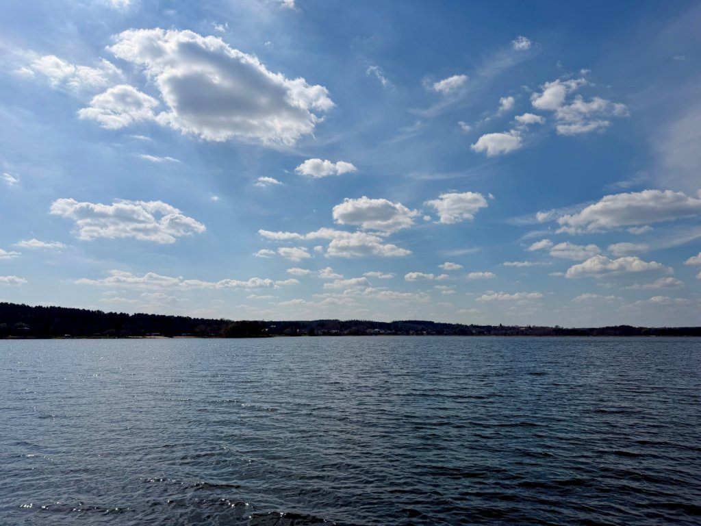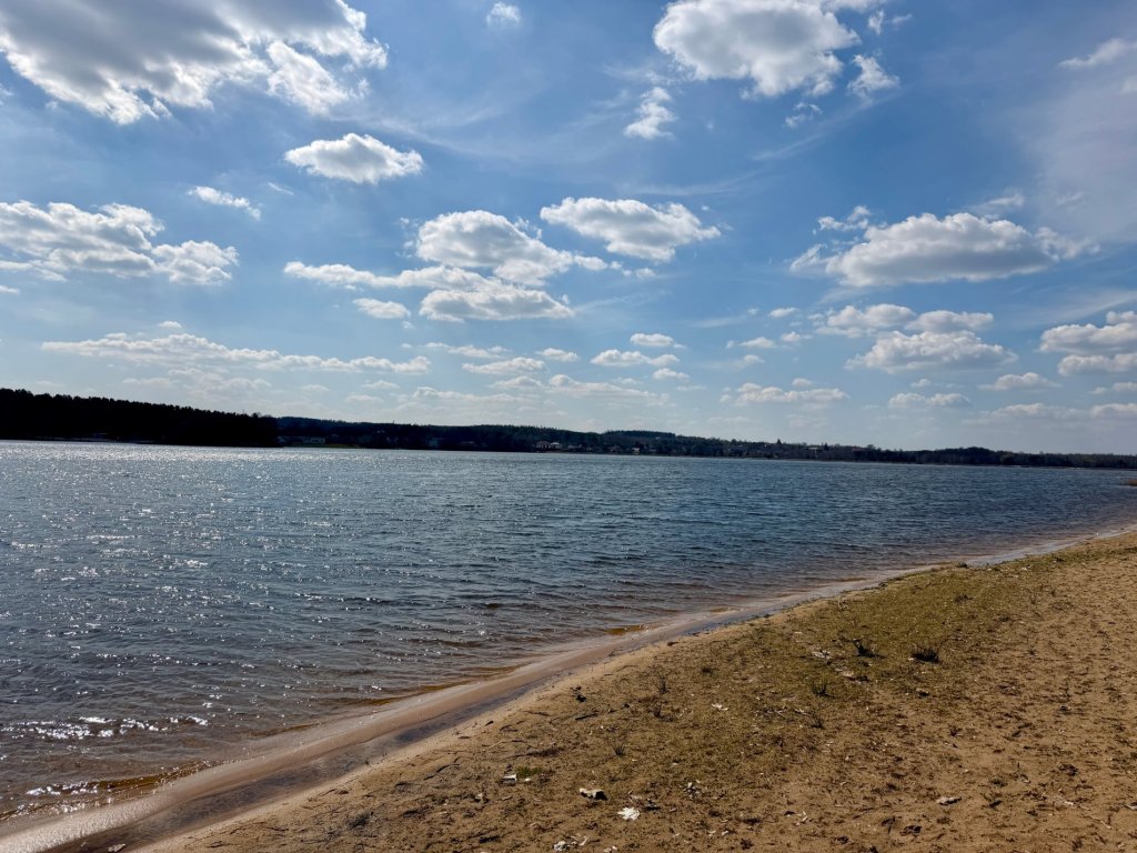 Słońce świeci mocno, niebo jest intensywnie niebieskie, a wiatr daje się we znaki od pierwszych kroków. Woda mieni się od światła i wygląda niemal jakby była pokryta drobnymi iskrami. Idziemy powoli wzdłuż brzegu, słuchając głównie szumu wiatru, ludzi jest na tyle mało, że łatwo złapać tu chwilę ciszy. Teraz jest spokojnie, ale już wiemy, że latem raczej byśmy tu nie przyjechali.