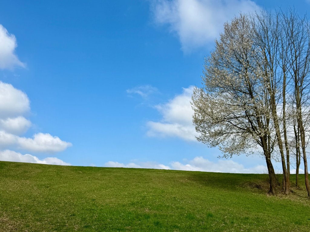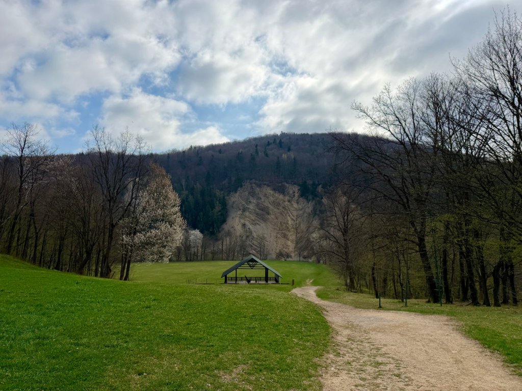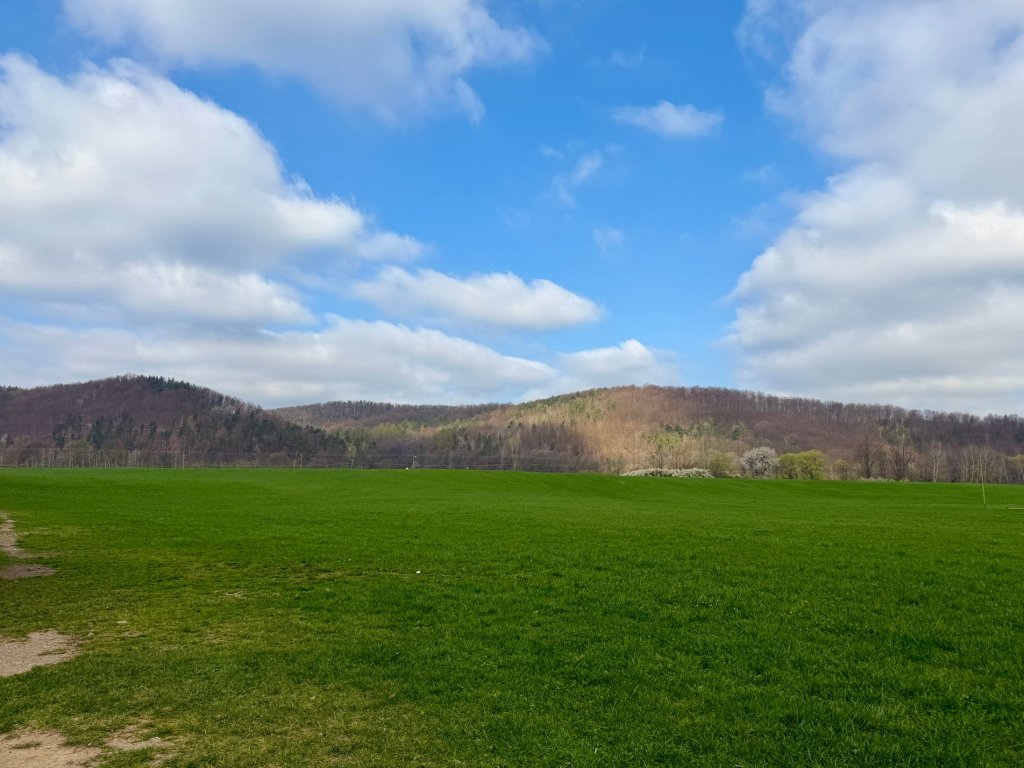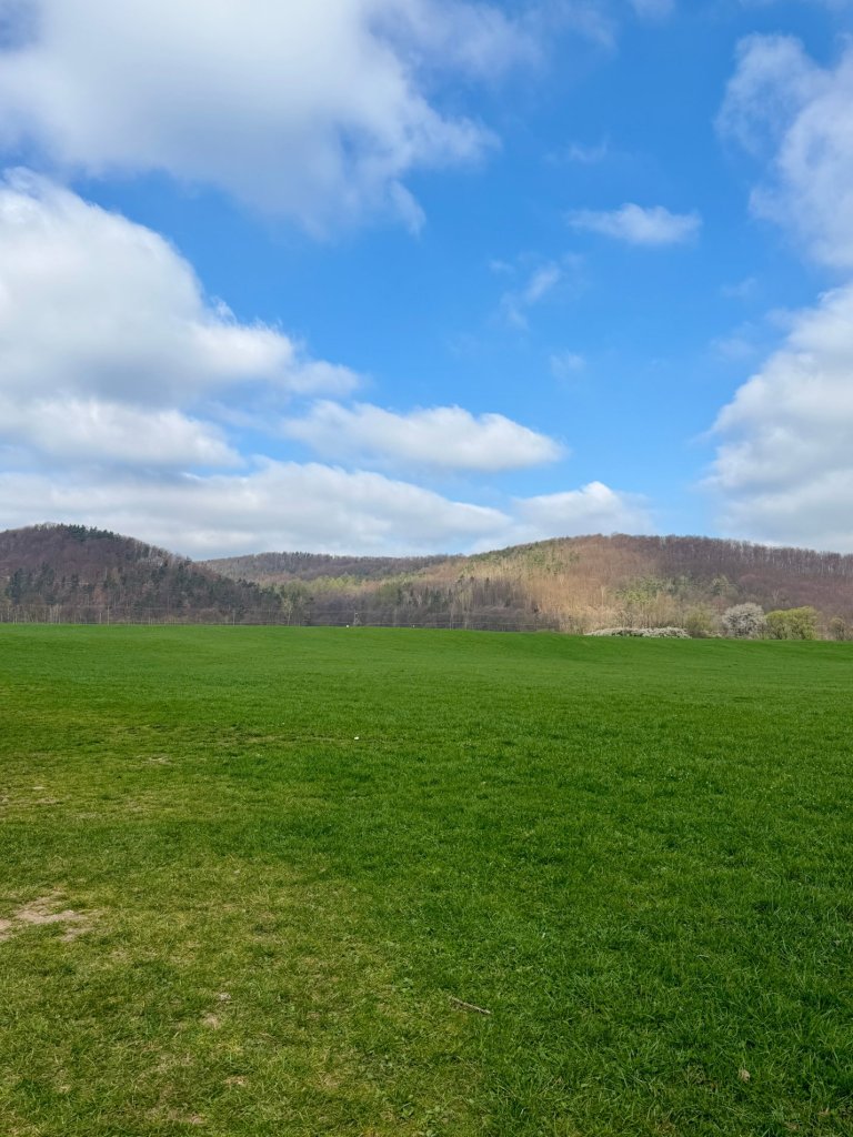 Powietrze jeszcze chłodne, około 10 stopni, niebo w większości zachmurzone, ale z przebijającymi się fragmentami błękitu. Dookoła łąki i pastwiska, a w oddali łagodne pagórki. Drzewa jeszcze bez liści, ale trawa już wyraźnie zielona, taki moment przejściowy, kiedy wiosna dopiero się rozkręca.