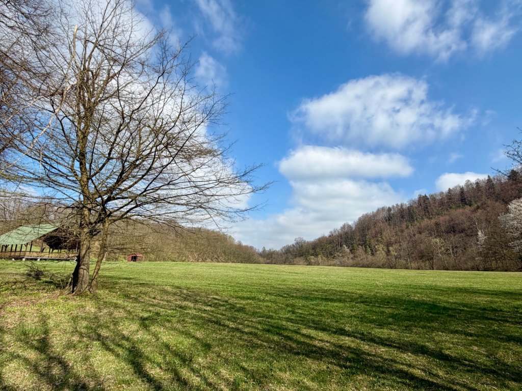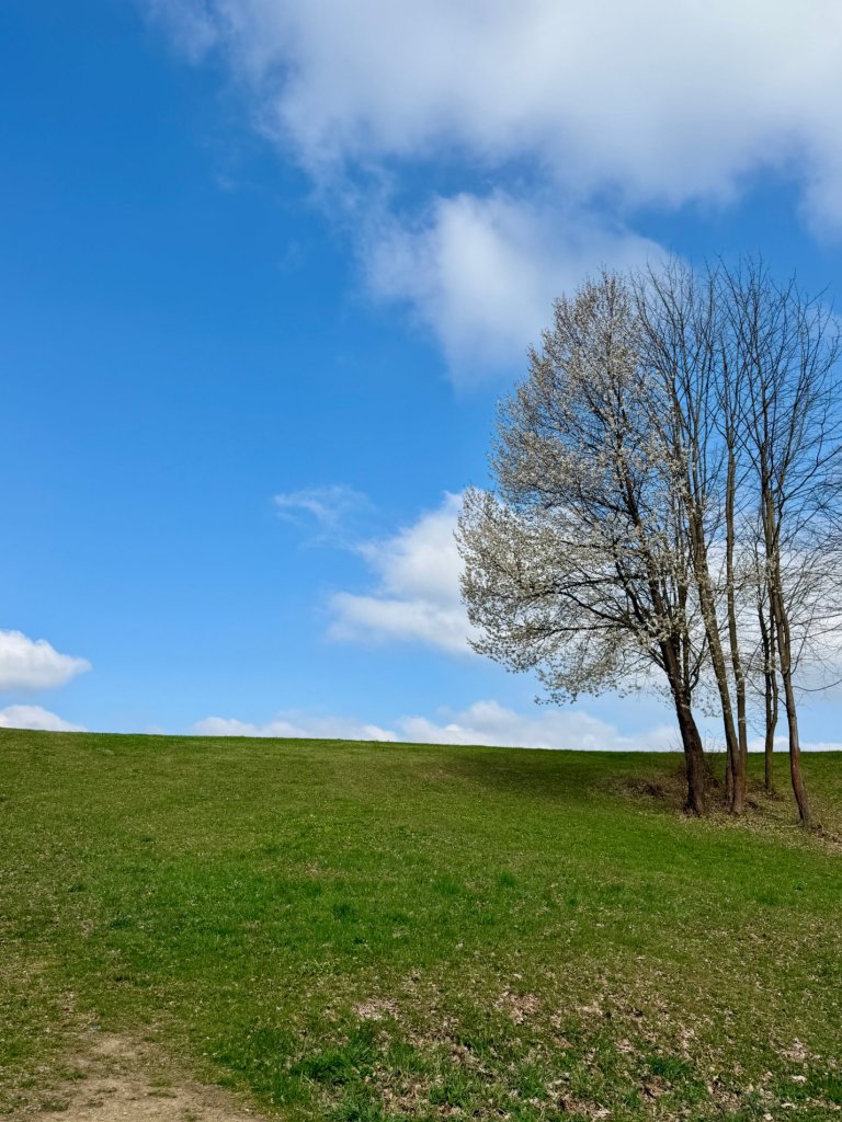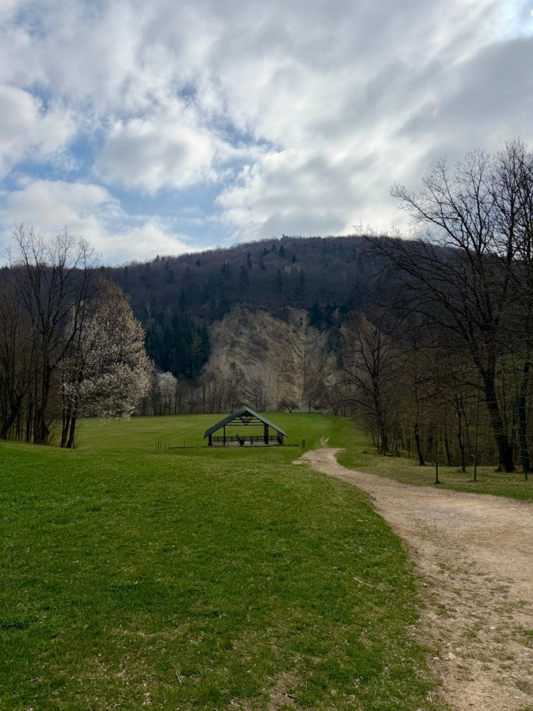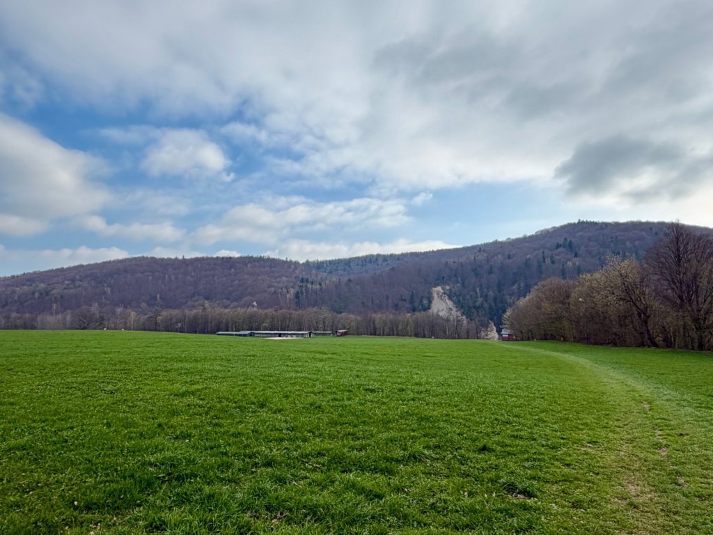 Powietrze jeszcze chłodne, około 10 stopni, niebo w większości zachmurzone, ale z przebijającymi się fragmentami błękitu. Dookoła łąki i pastwiska, a w oddali łagodne pagórki. Drzewa jeszcze bez liści, ale trawa już wyraźnie zielona, taki moment przejściowy, kiedy wiosna dopiero się rozkręca.