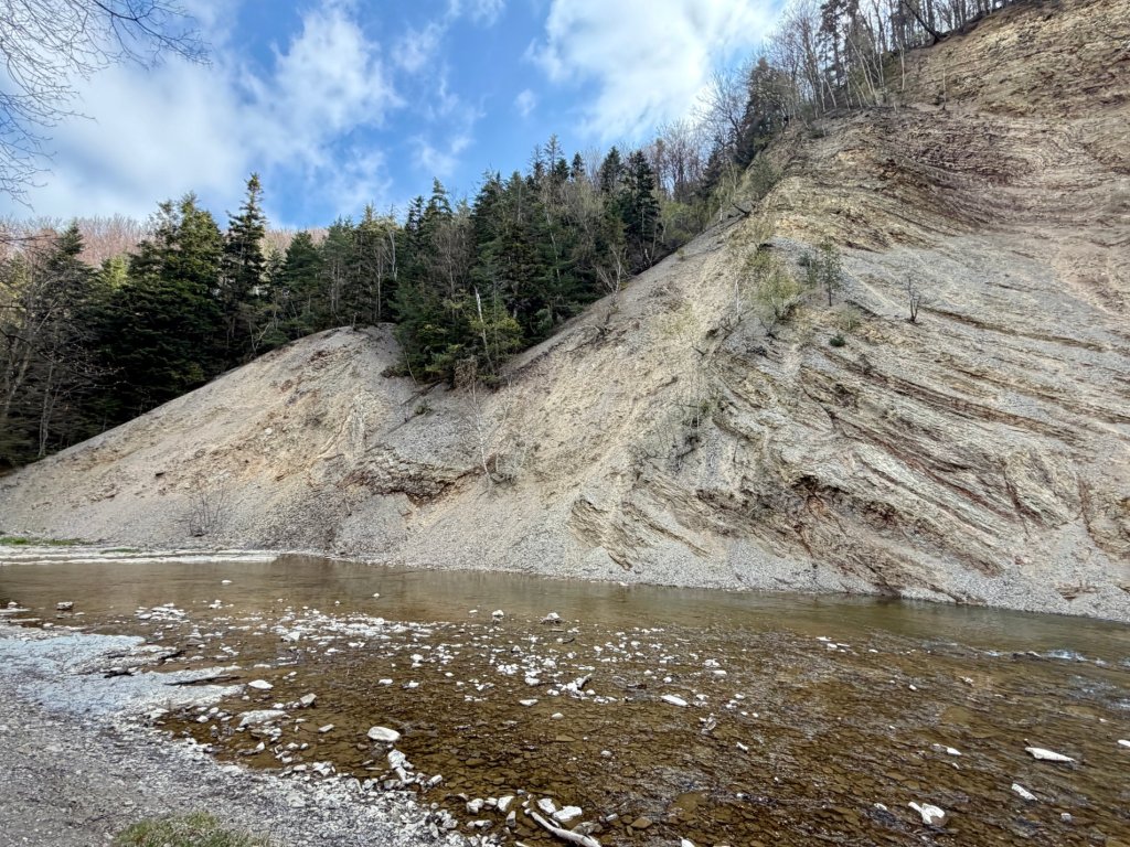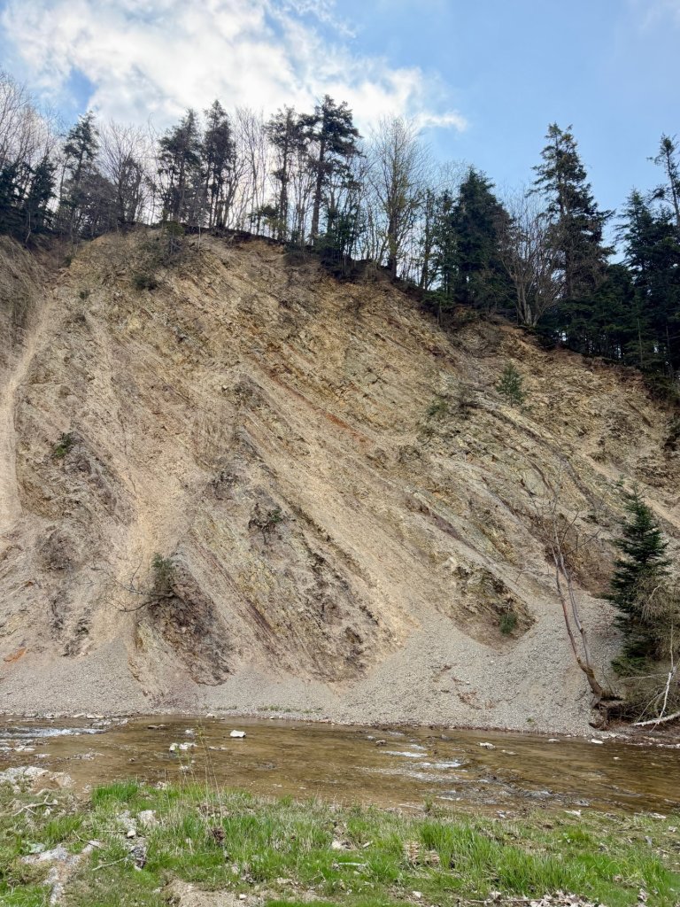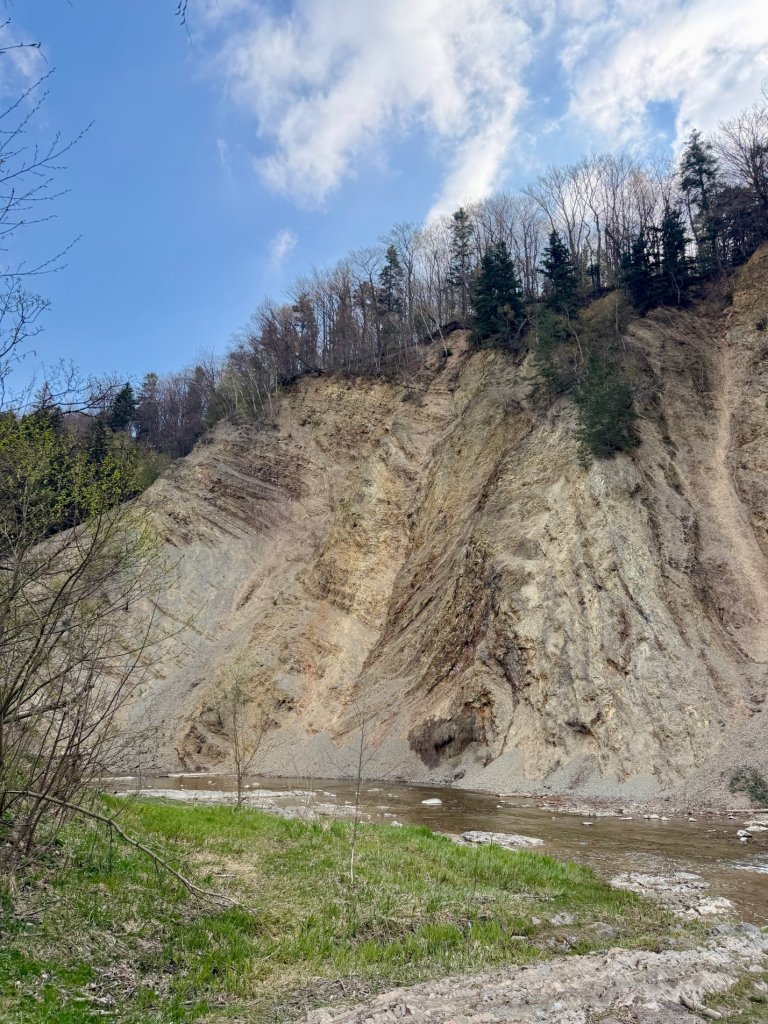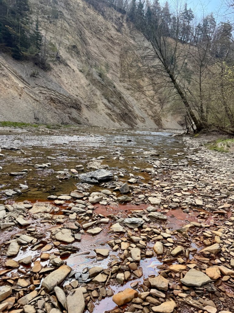 Warstwy skał, osuwiska, drzewa wyrastające gdzieś z góry, wszystko to wygląda trochę dziko, trochę surowo, a trochę przypomina nam świętokrzyskie kamieniołomy. I do tego cisza. Pusto. Bez tłumów, bez hałasu.