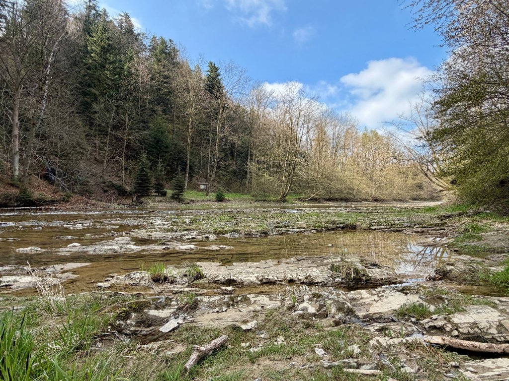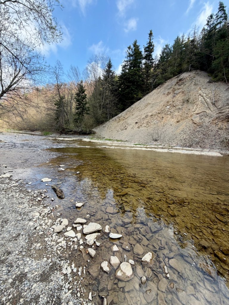 Schodzimy bliżej rzeki. Woda jest bardzo przejrzysta, spokojna, a pod powierzchnią widać kamienne dno, ułożone w charakterystyczne, lekko skośne pasy.