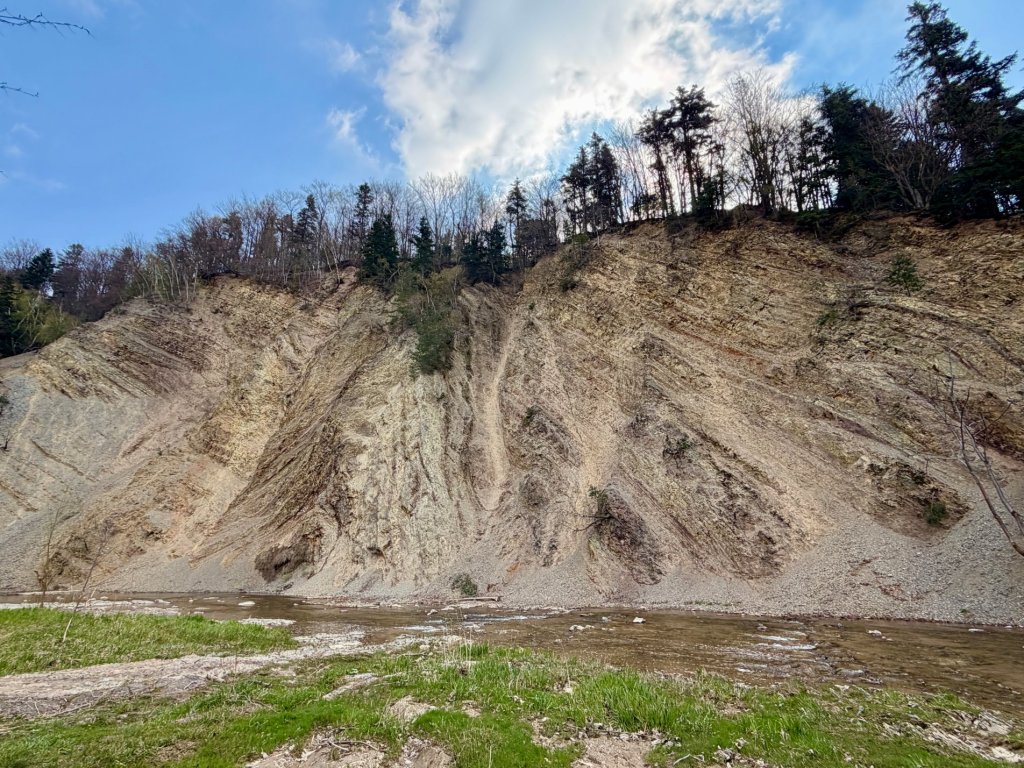 To, co dziś widzimy, to tzw. łupki menilitowe, skały powstałe z materiału organicznego, który osadzał się w wodzie. Co ciekawe, właśnie z takich osadów powstawała ropa naftowa. Tabliczka tłumaczy, że materia organiczna (głównie plankton) była przez miliony lat przekształcana pod wpływem temperatury i ciśnienia, aż powstały z niej węglowodory.
