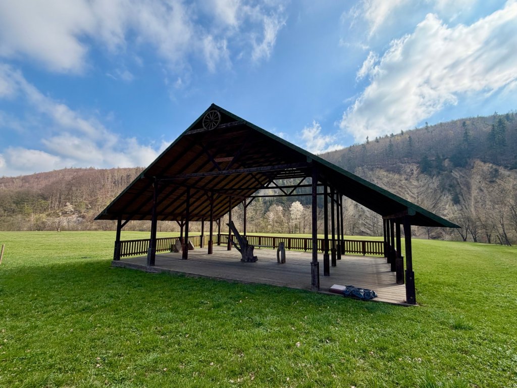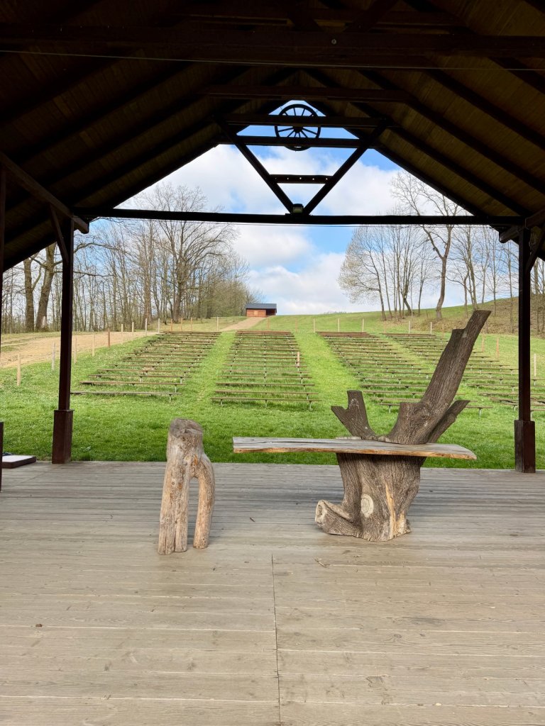 Po drodze trafiamy na ciekawą konstrukcję, wiata, ławki ustawione jakby amfiteatralnie, trochę jak scena albo ołtarz. Nie do końca wiemy, do czego to służy, ale wygląda intrygująco i trochę nietypowo jak na takie miejsce.