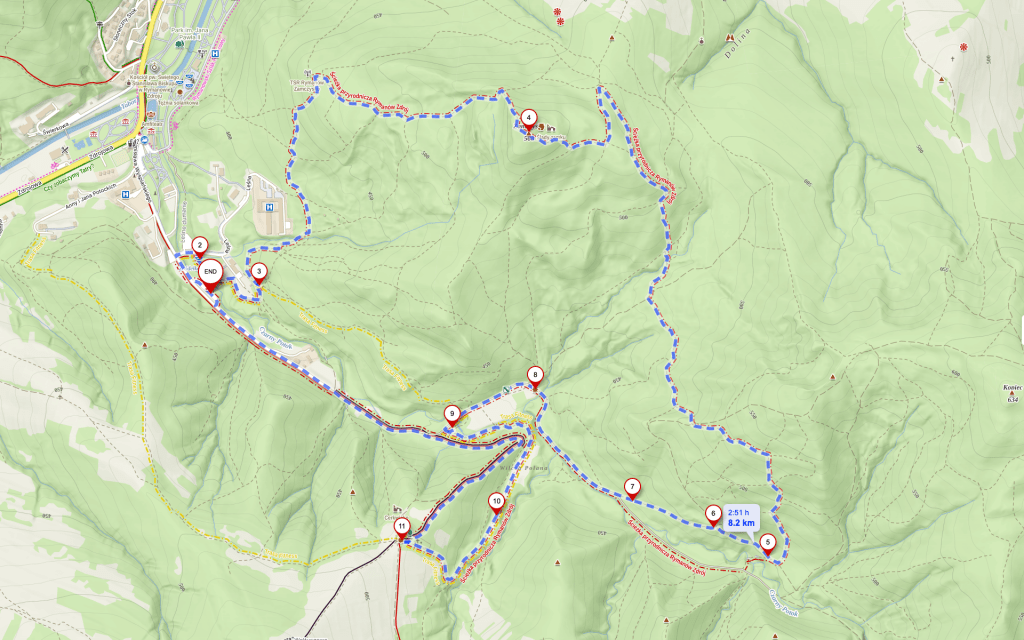 Trasa: Parking – Z parkingu skręcamy w prawo i wracamy do skrzyżowania, na którym skręcamy w prawo – Następnie po około 20m ponowie w prawo do źródełka – Kierujemy się oznaczeniami ścieżki (znaki lasów państwowych, lub znak przekreślonego koła, którego połówka jest czerwona) – Obchodzimy teren uzdrowiska – W prawo odbija szlak fitnes a my idziemy dalej prosto – Droga teraz będzie się pięła cały czas w górę – Mijamy wieżę TSR (retransmisji telewizyjnej) i skręcamy w prawo – Dochodzimy do szczytu Zamczyska – Idziemy dalej w dół – Po około 500 m skręcamy w lewo w wąską ścieżkę między drzewami (trzeba zwracać uwagę na znaki) – Dalej idziemy cały czas zgodnie z oznaczeniami szlaku – Dochodzimy do szerokiej drogi leśnej, która wiedzie wzdłuż strumyka Czarny Potok – Po dojściu do źródełka Krokusowe skręcamy ostro w lewo i idziemy pod górę do Cerkiewiska – Za cmentarzem skręcamy w prawo i schodzimy w dół – Wracamy do źródełka Krokusowe i przy nim skręcamy w lewo – Drogę przechodzi w po pewnym czasie w asfalt – Parking