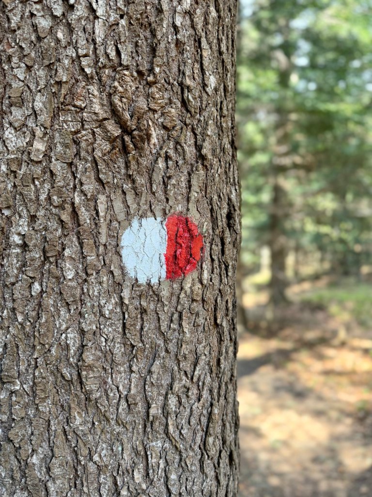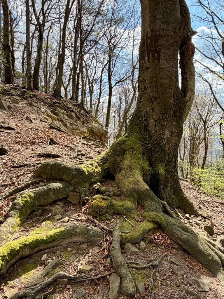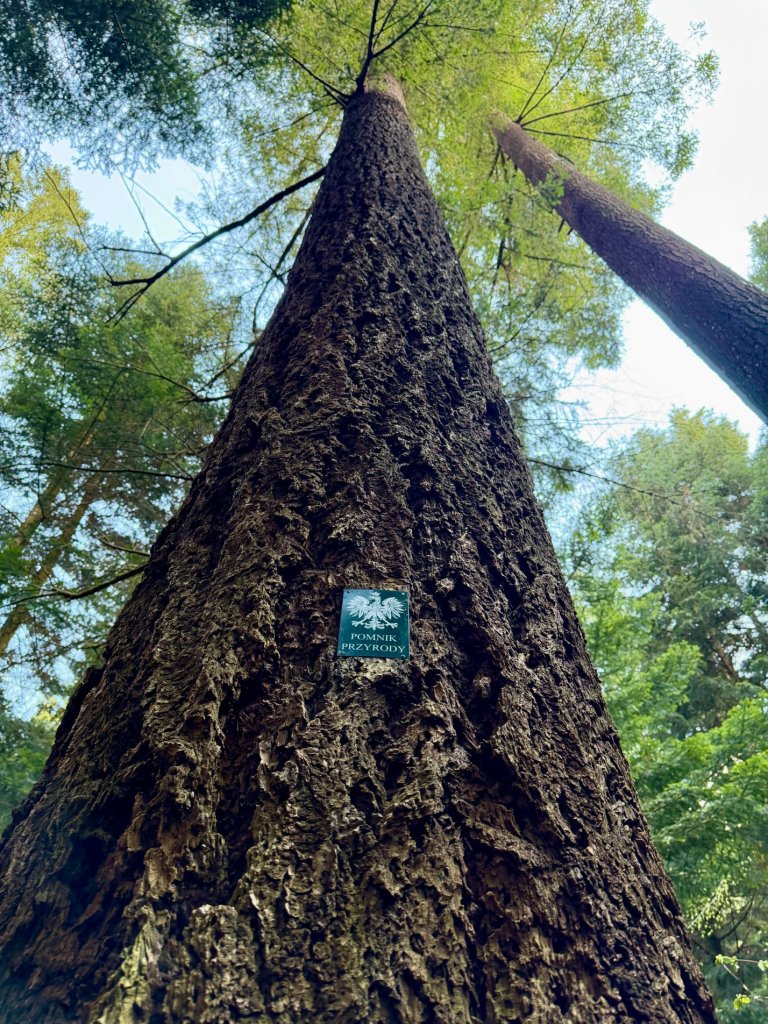 Dalej znowu pod górę. I jeszcze raz. I jeszcze kawałek w dół, gdzie pojawia się ławka, ale nawet się nie zatrzymujemy, chcemy już tylko wyjść z tego fragmentu. Mijamy pomnik przyrody, ale nawet nie zatrzymujemy się na dłuższe podziwianie drzewa.