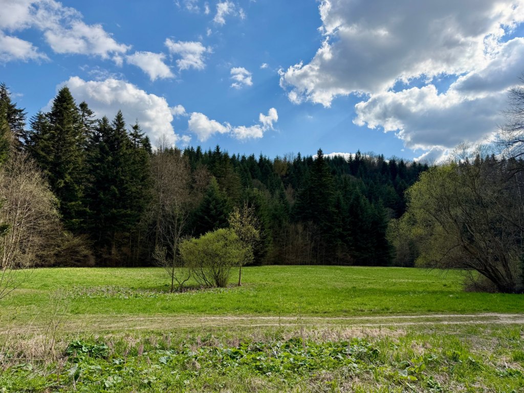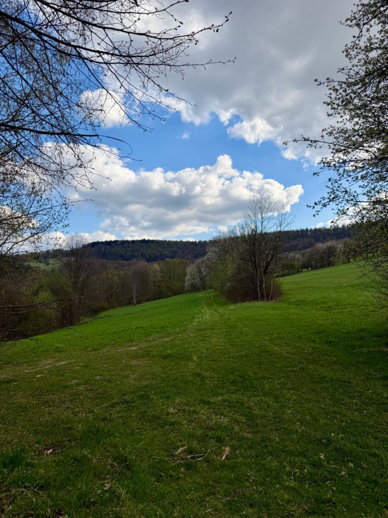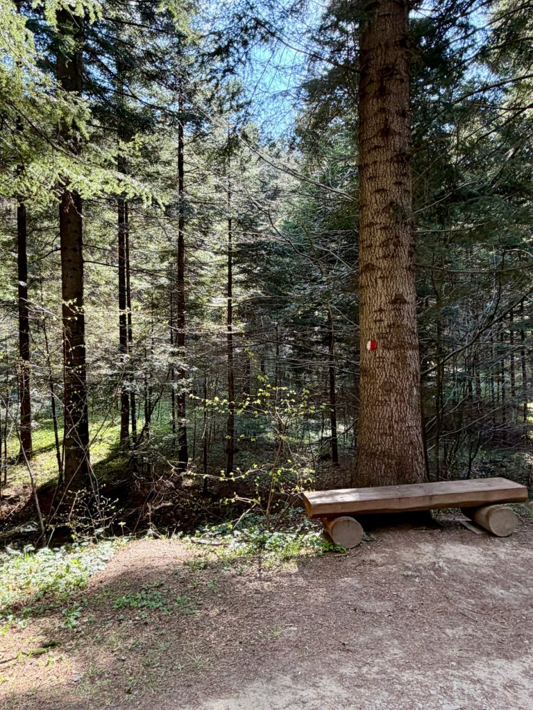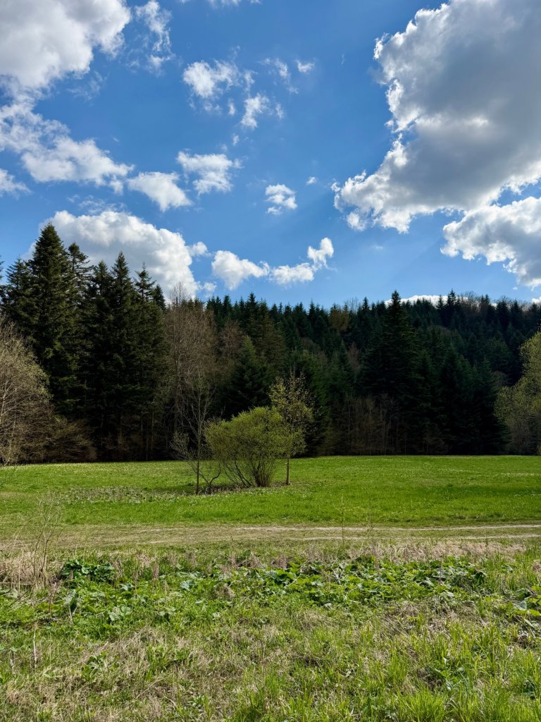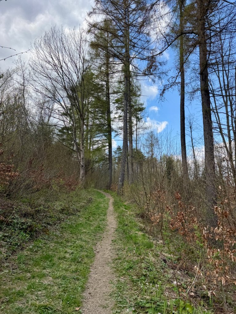 Po drodze pojawiają się wiosenne kwiaty, kolejne ławki, kapliczka św. Huberta. Dochodzimy do zielonej łączki, naprawdę ładnej, szczególnie z tym kontrastem: świeża trawa, jeszcze lekko „łyse” drzewa i błękit nieba między chmurami. Tutaj w końcu siadamy na chwilę.