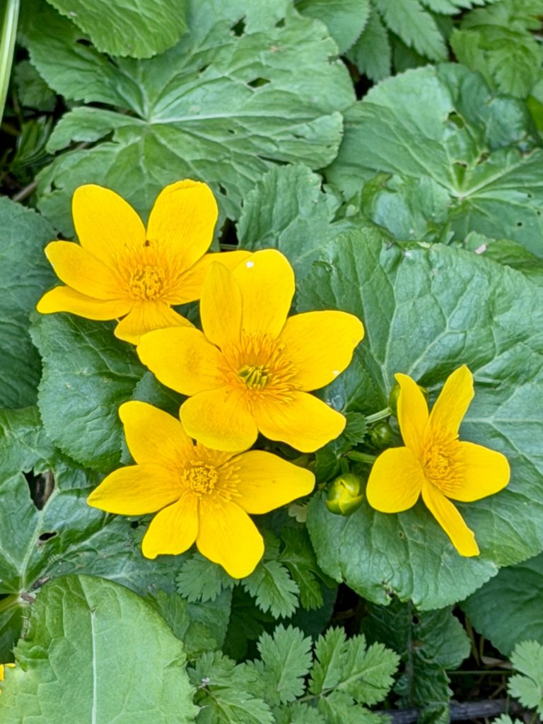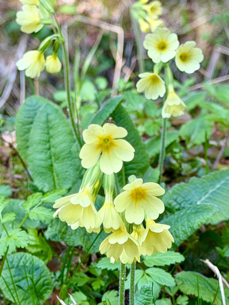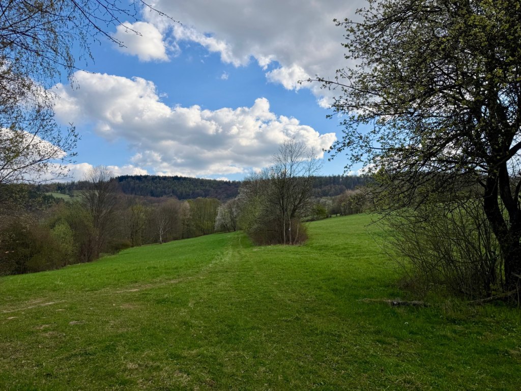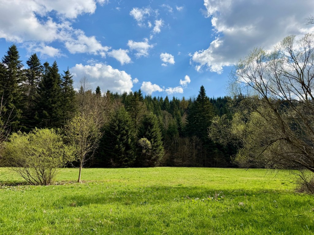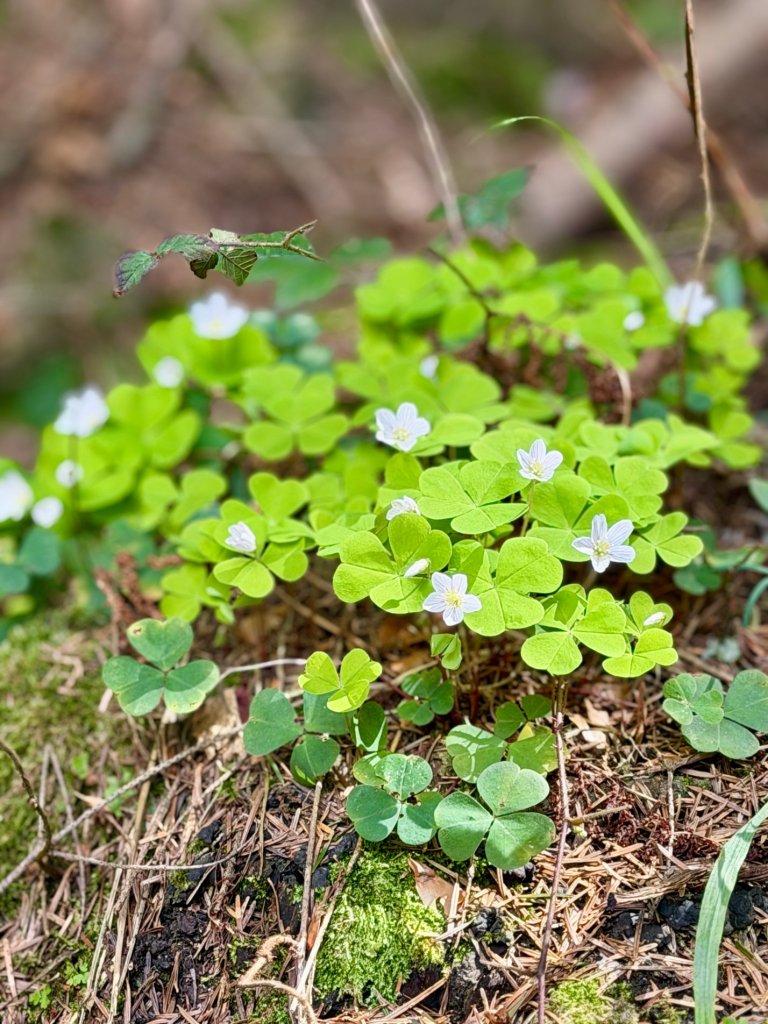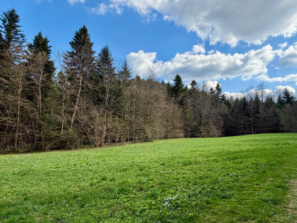 Po drodze pojawiają się wiosenne kwiaty, kolejne ławki, kapliczka św. Huberta. Dochodzimy do zielonej łączki, naprawdę ładnej, szczególnie z tym kontrastem: świeża trawa, jeszcze lekko „łyse” drzewa i błękit nieba między chmurami. Tutaj w końcu siadamy na chwilę.