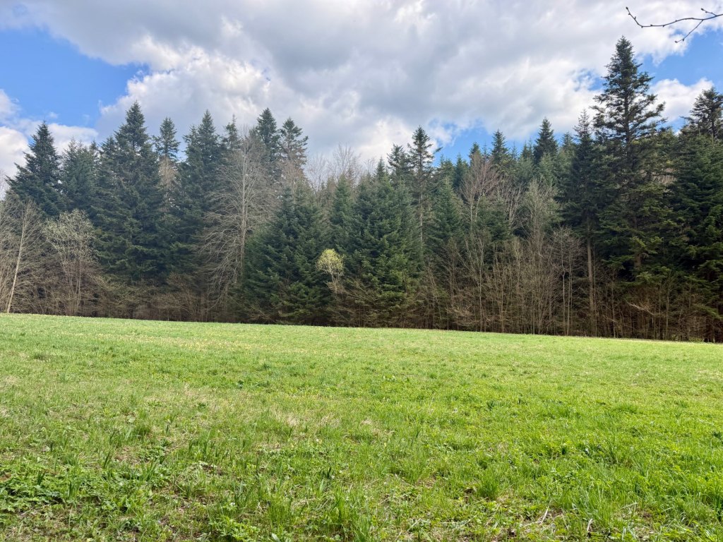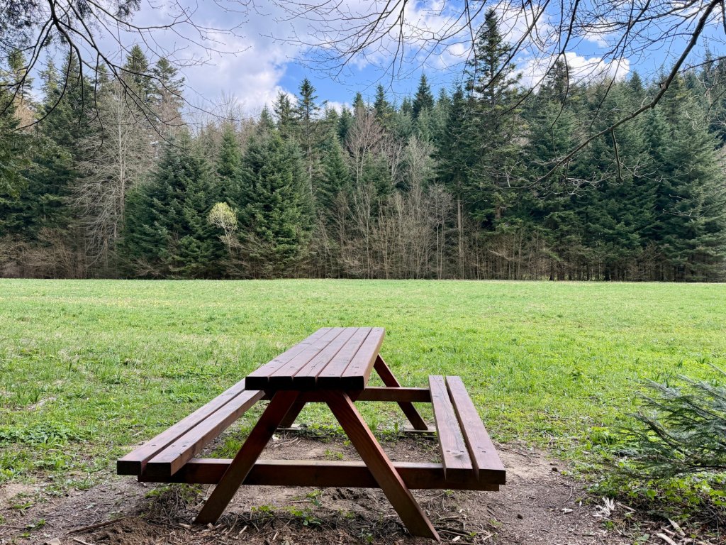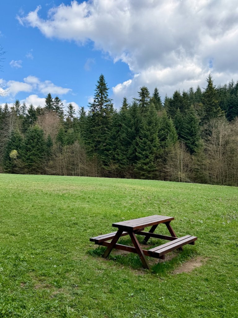 W końcu pojawia się więcej światła. Docieramy do ławki, teren lekko się otwiera, pojawia się trochę trawy i słońce przebijające się przez chmury.