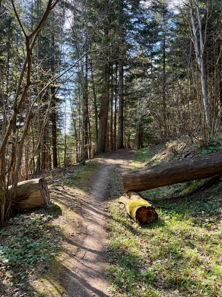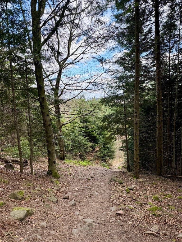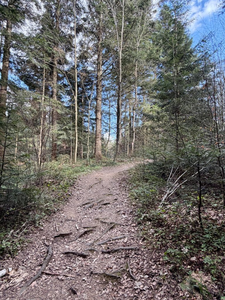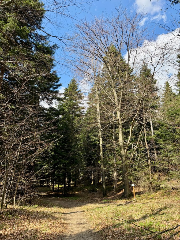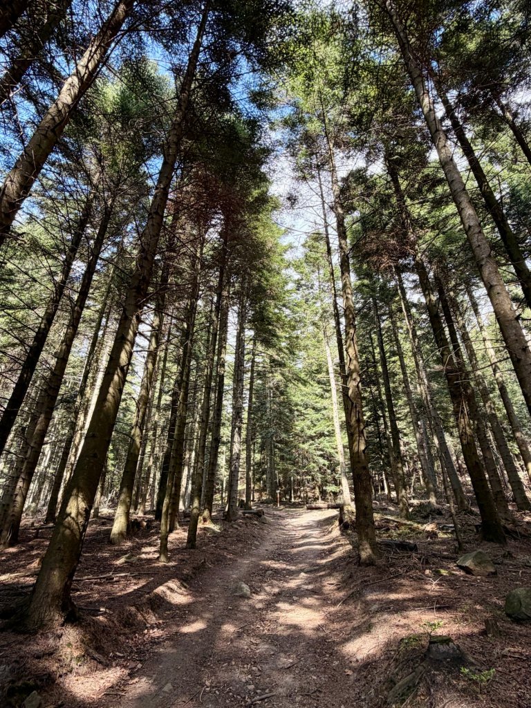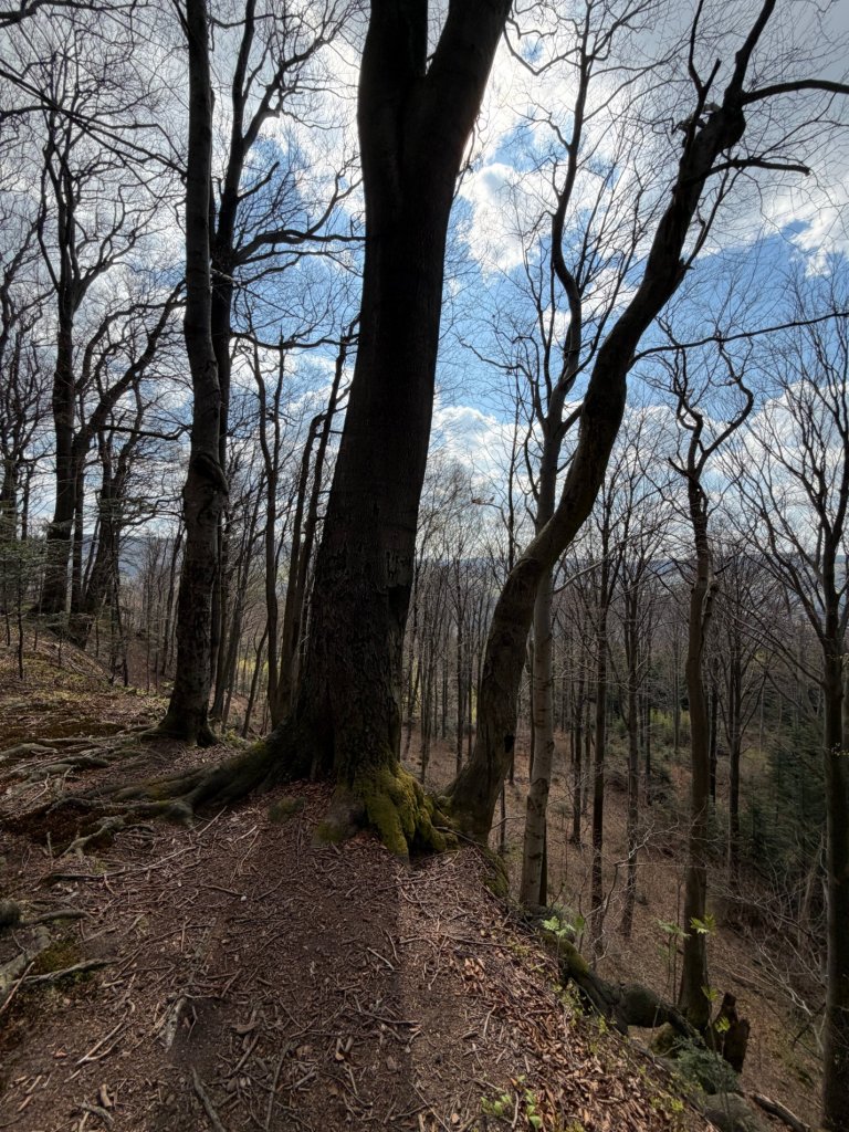 Odbijamy w wąską, krętą ścieżkę. Po drodze pojawiają się momenty naprawdę zapadające w pamięć, powykrzywiane drzewa, prześwity między gałęziami, przez które widać niebo, światło wpadające w ciemny las, malownicze widoki. Ale to nadal nie jest łatwy odcinek.