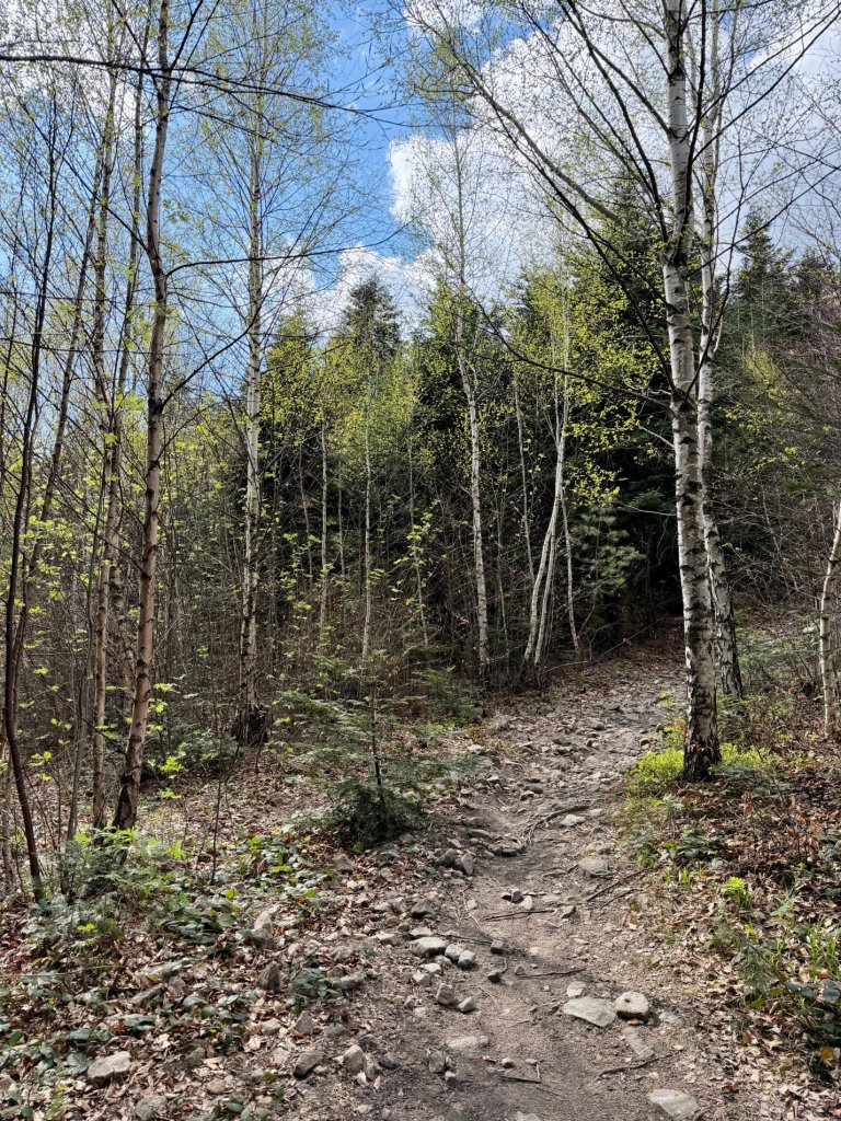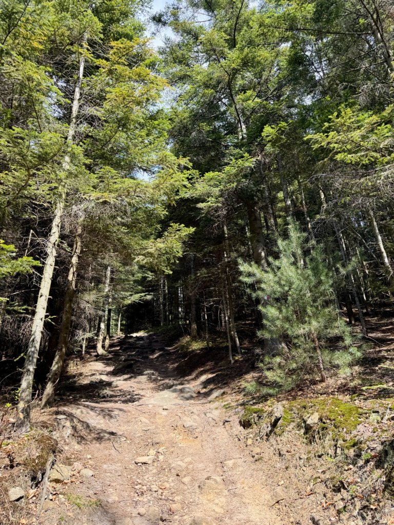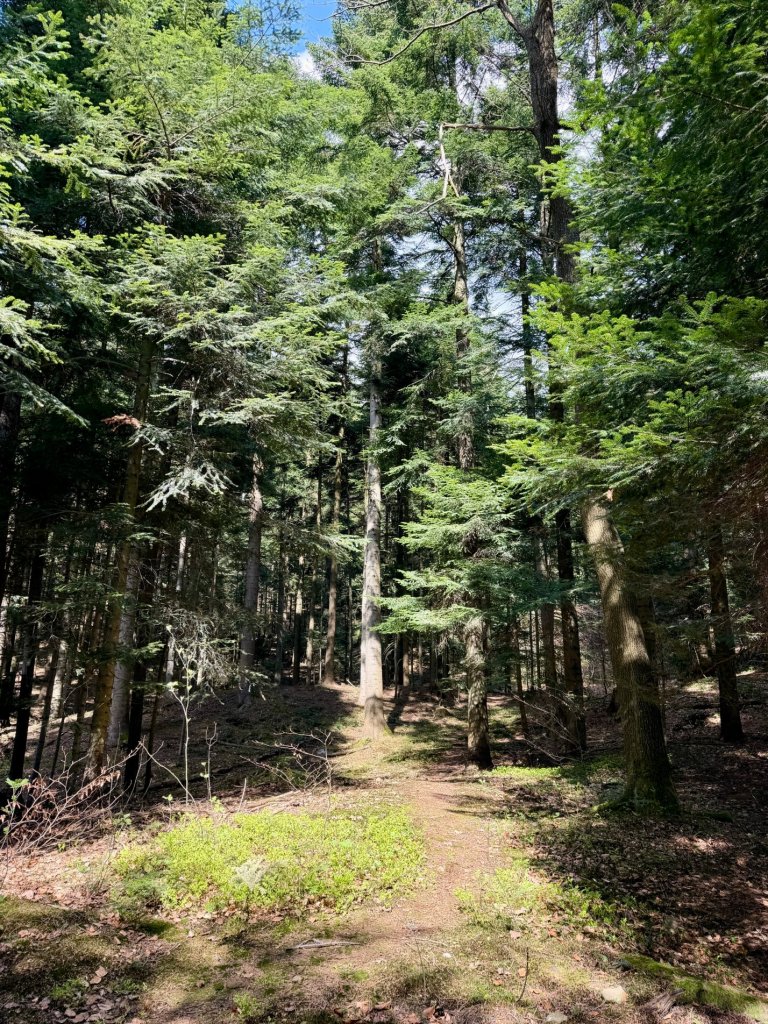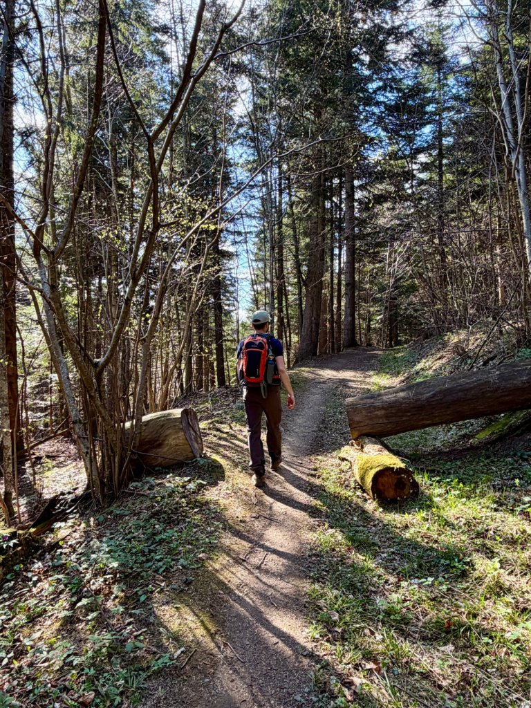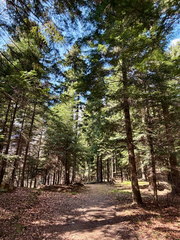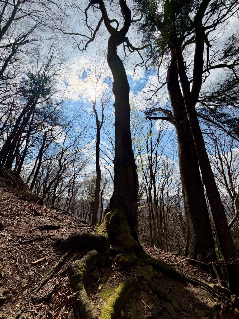 Odbijamy w wąską, krętą ścieżkę. Po drodze pojawiają się momenty naprawdę zapadające w pamięć, powykrzywiane drzewa, prześwity między gałęziami, przez które widać niebo, światło wpadające w ciemny las, malownicze widoki. Ale to nadal nie jest łatwy odcinek.