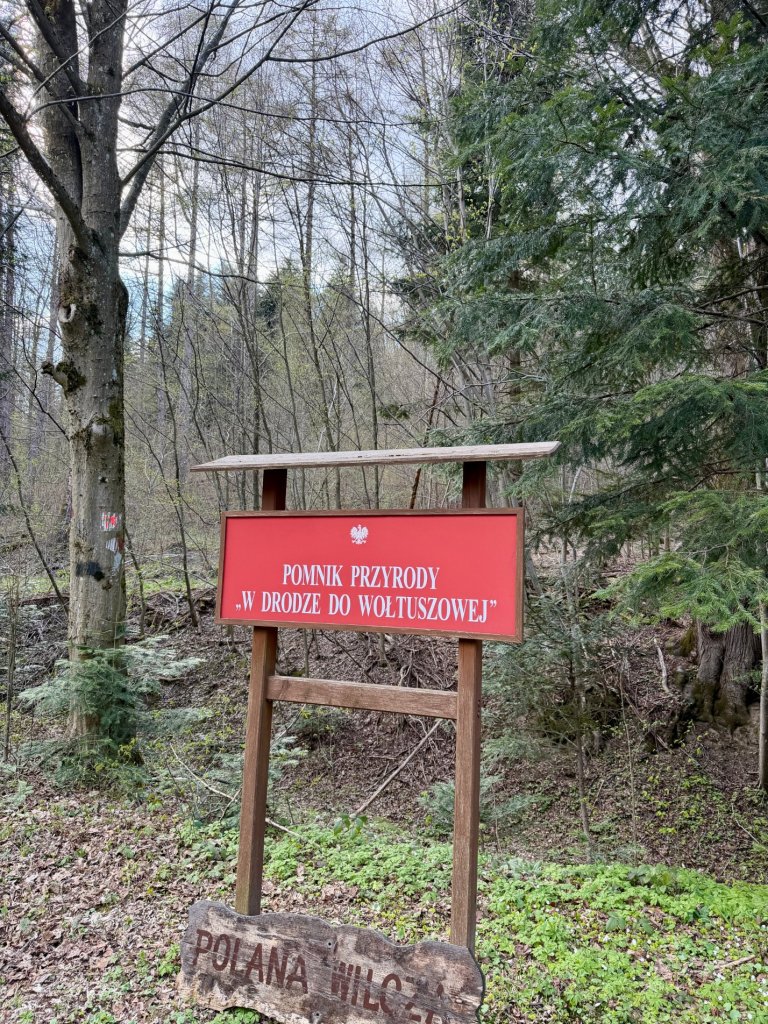 W końcu docieramy na Polanę Wilczą. Tutaj jest przestrzeni, dla nas to chwila oddechu. Pojawia się oznaczenie pomnika przyrody, a także kolejne elementy ścieżki fitness. Niestety chmury robią się coraz cięższe, więc nie zatrzymujemy się tu na długo.