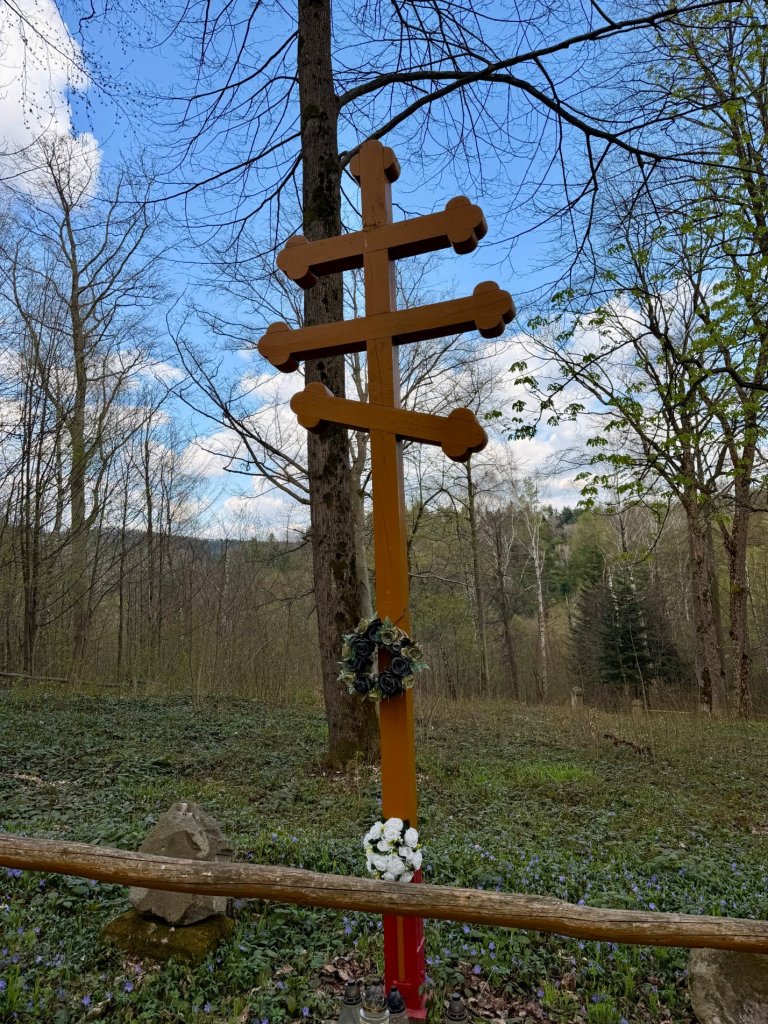 Idziemy dalej pod górę i trafiamy w miejsce o zupełnie innym klimacie. Ogrodzony cmentarz, stare groby, prawosławny krzyż. Cisza, trochę cięższa, bardziej refleksyjna atmosfera. Tabliczki informacyjne opowiadają historię tego miejsca. LINK!!