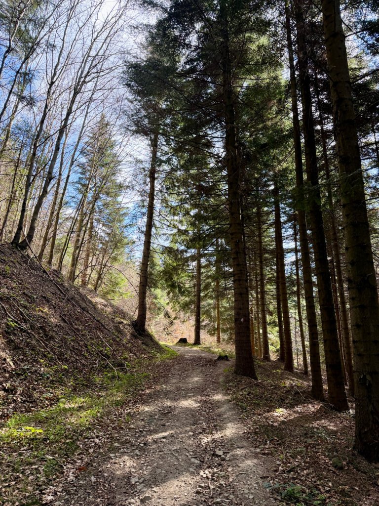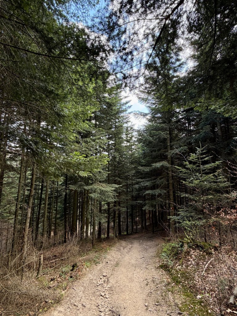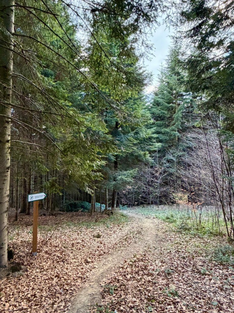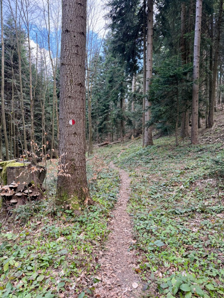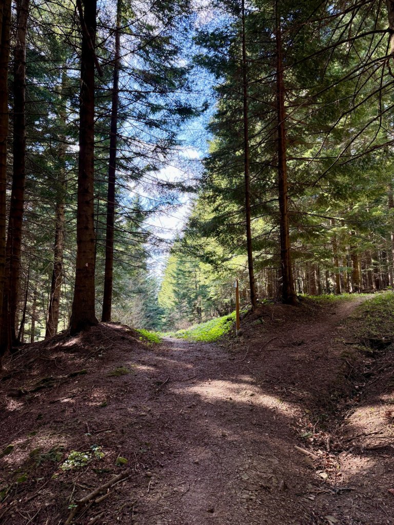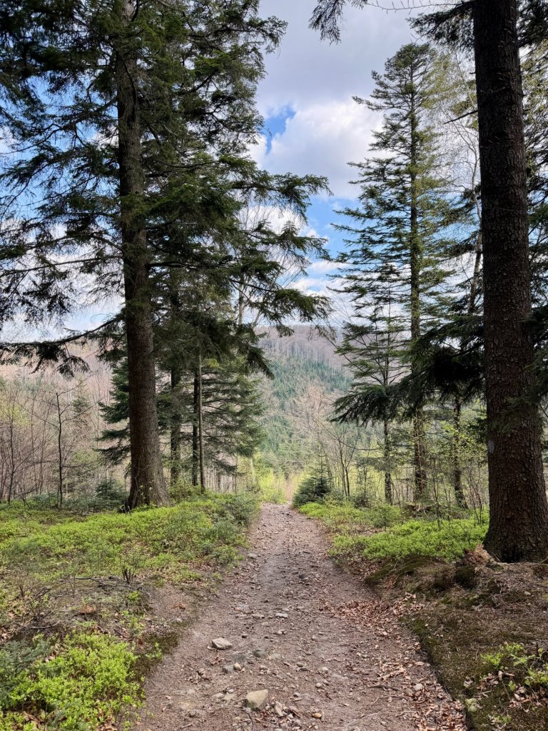 Las nadal jest ciemny, wysoki, trochę przytłaczający. Dopiero niżej zaczyna się zmieniać, pojawia się więcej zieleni, więcej światła, a ścieżka stopniowo wyprowadza nas w stronę doliny.