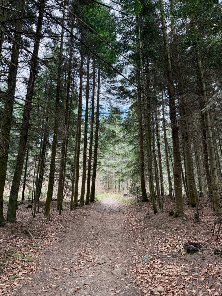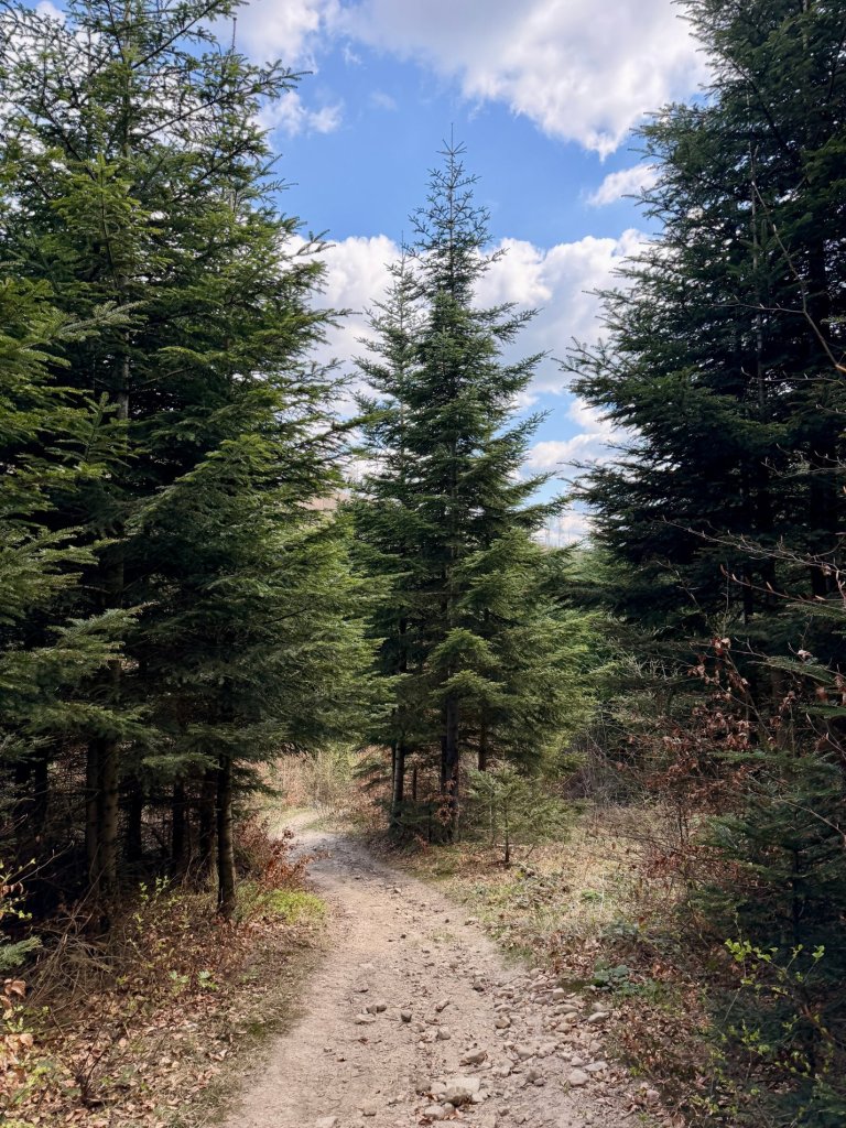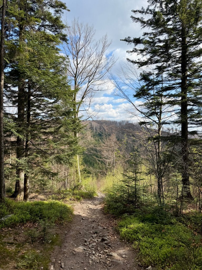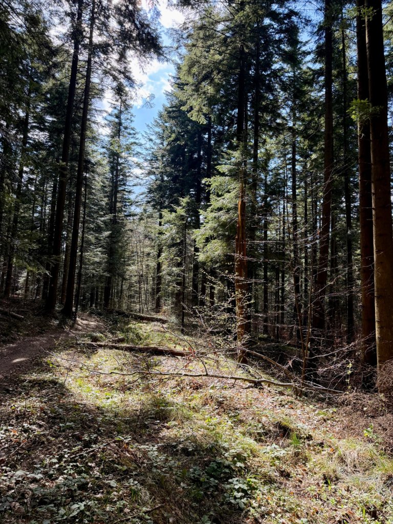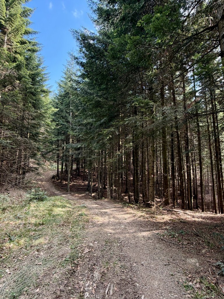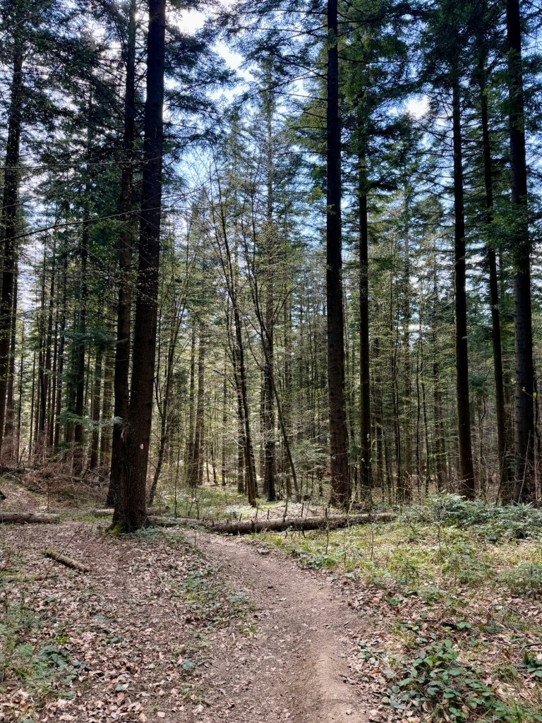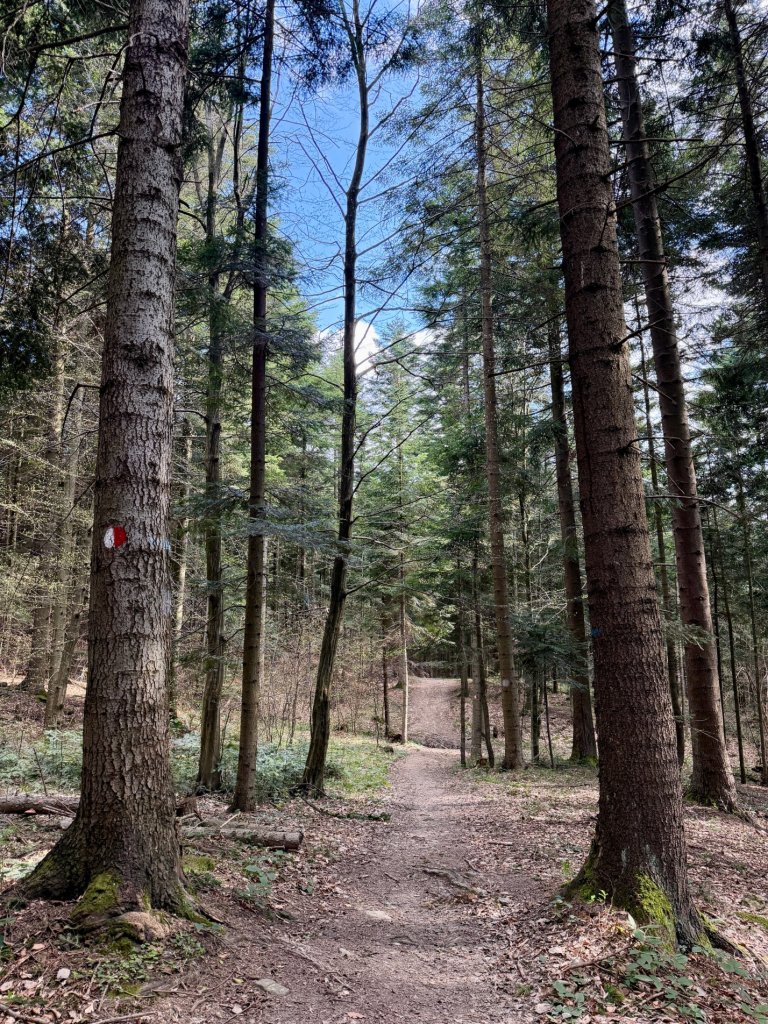 Las nadal jest ciemny, wysoki, trochę przytłaczający. Dopiero niżej zaczyna się zmieniać, pojawia się więcej zieleni, więcej światła, a ścieżka stopniowo wyprowadza nas w stronę doliny.