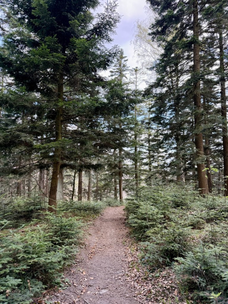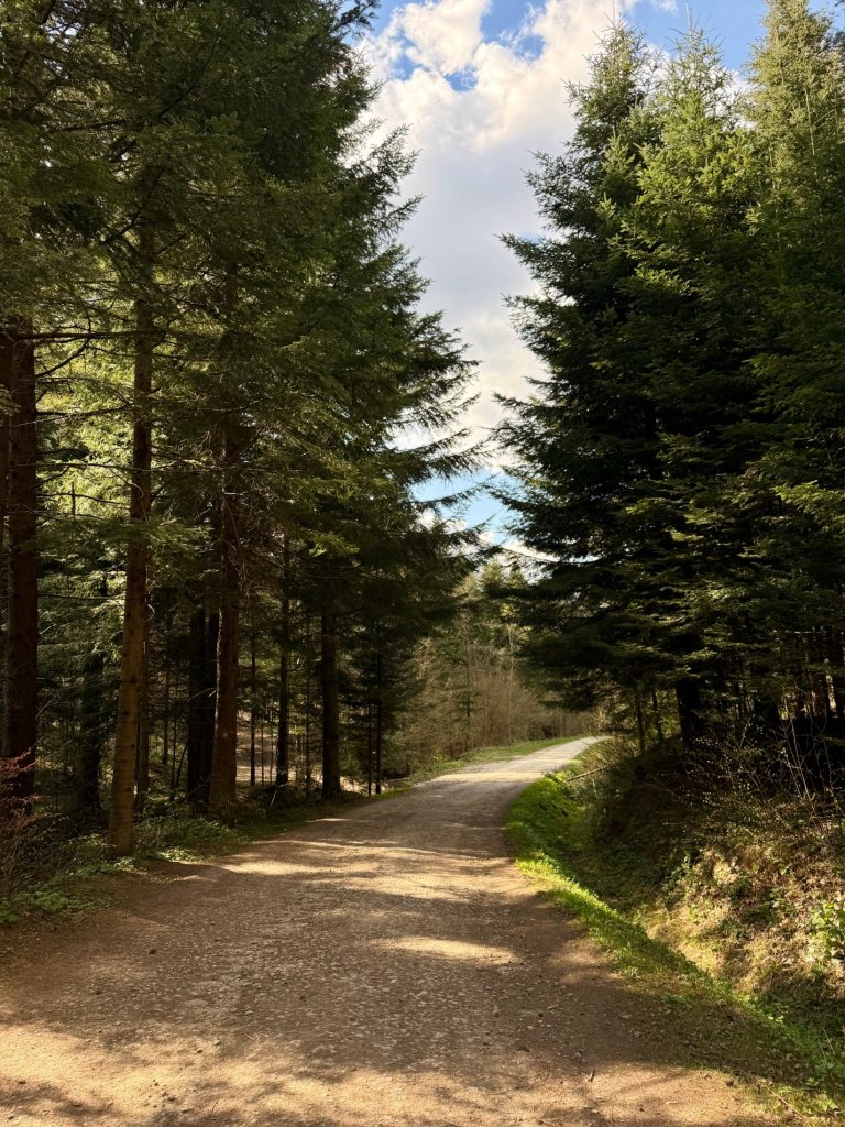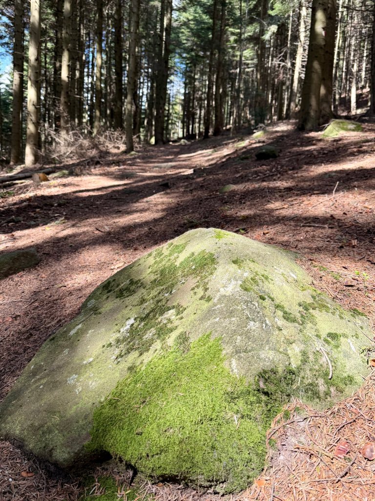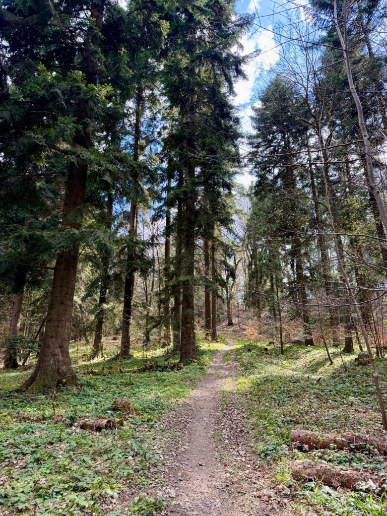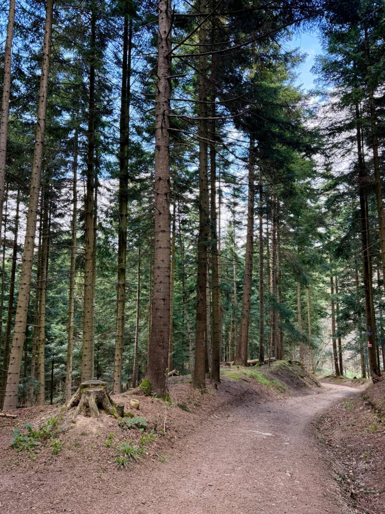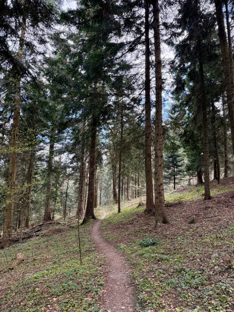 Las nadal jest ciemny, wysoki, trochę przytłaczający. Dopiero niżej zaczyna się zmieniać, pojawia się więcej zieleni, więcej światła, a ścieżka stopniowo wyprowadza nas w stronę doliny.