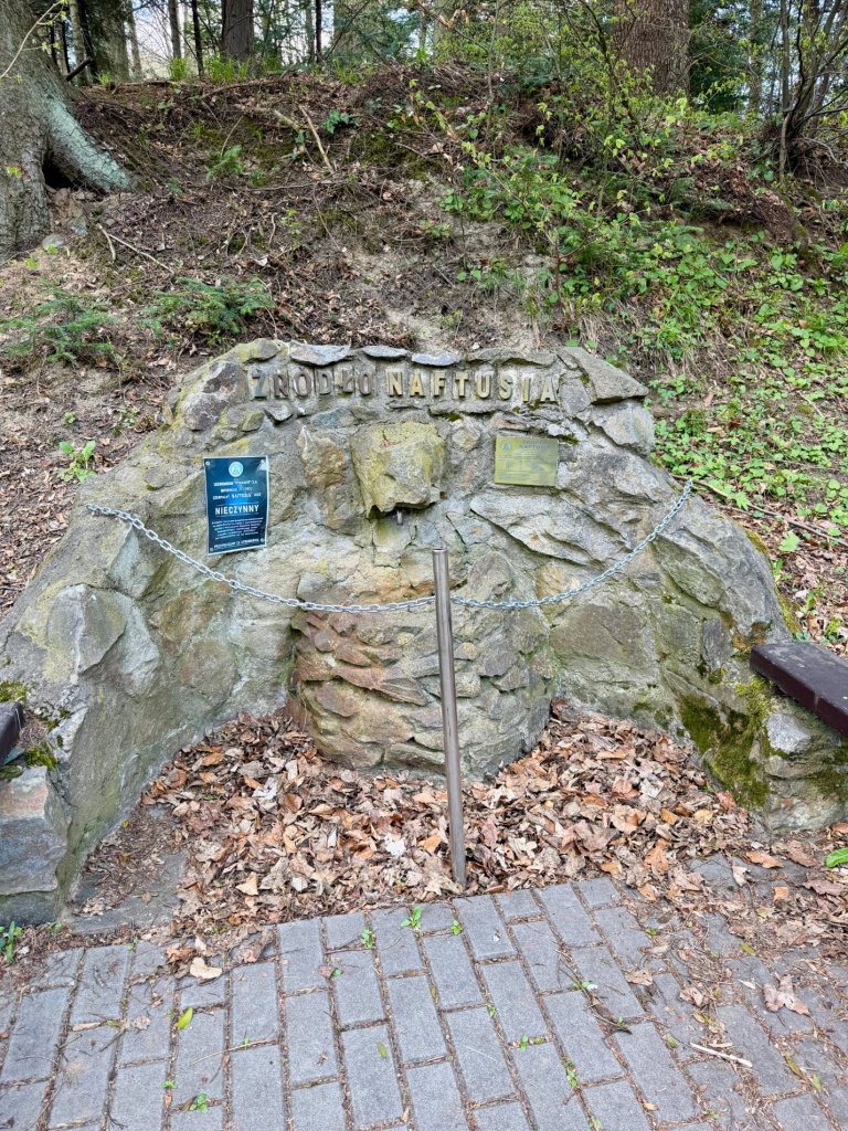 Docieramy do źródła Naftusia, ale niestety jest nieczynne, więc nie zatrzymujemy się tu na długo. Idziemy dalej chodnikiem, mijając kolejne fragmenty uzdrowiska, aż w końcu skręcamy w leśną drogę. To moment, w którym coś się zmienia, zostawiamy za sobą trasę fitness, pozostałych spacerowiczów i zaczyna się bardziej „nasza” część.