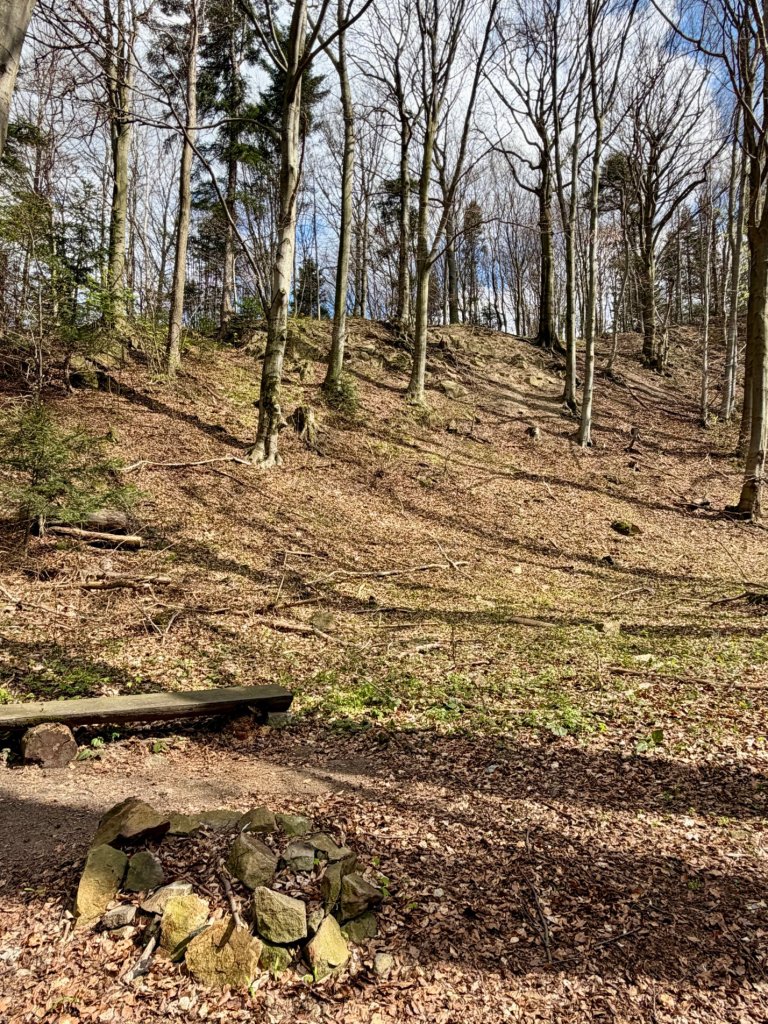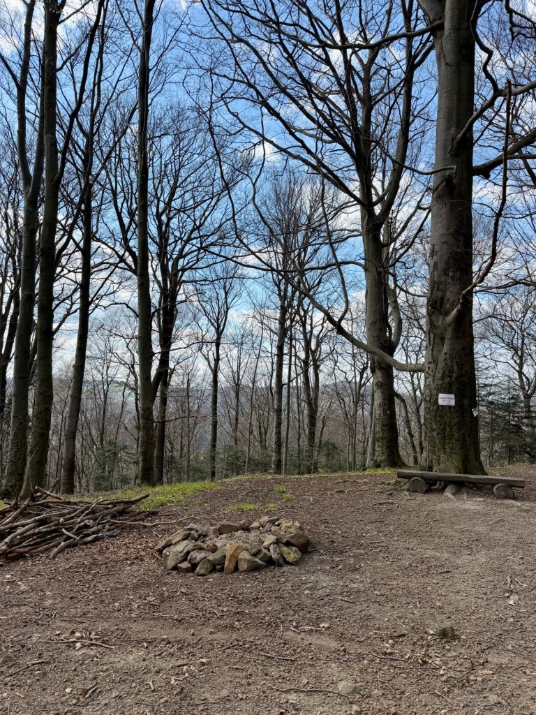 Na górze jest prosto. Kartka przypięta do pnia drzewa, ławka, miejsce na ognisko. Bez spektakularnych widoków, bez „efektu wow”, ale z poczuciem, że to podejście trzeba było sobie wypracować.