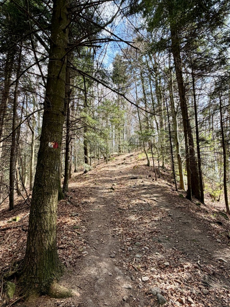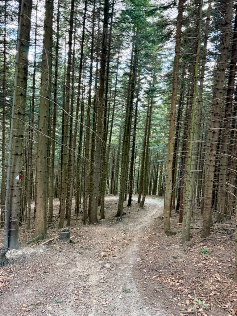 Szlak zakręca kilka razy, prowadzi w górę, momentami dość stromo. Jest ciepło, ale nad nami zbierają się coraz cięższe chmury, przez co w lesie robi się jeszcze ciemniej. Na chwilę teren się wypłaszcza, ale znowu zamienia się w wąską, krętą drogę pod górę.