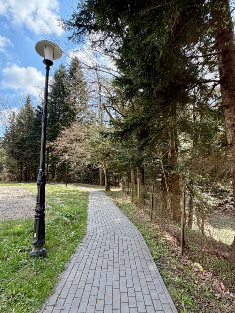 Pierwsze metry prowadzą asfaltem, w okolicy uzdrowiska. To bardziej spacer niż wejście w las, chodnik, zabudowania, wszystko uporządkowane i dość „cywilizowane”.