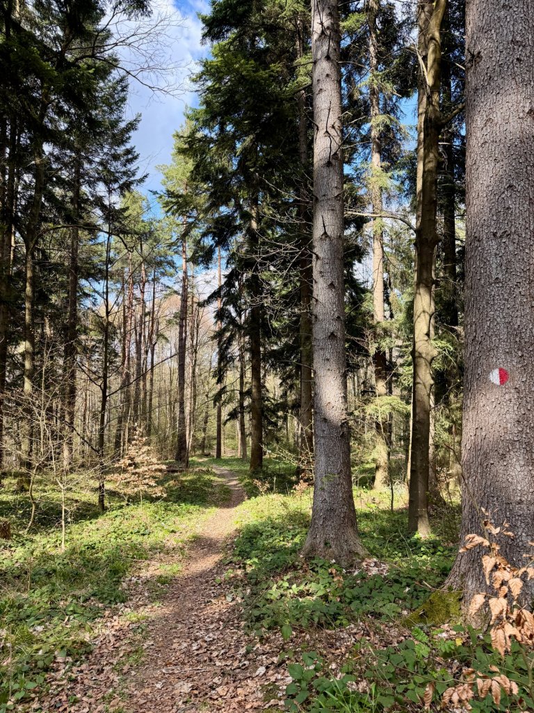 Las robi się wyraźnie ciemniejszy i gęstszy. Wysokie drzewa, mało światła przy ziemi, ściółka jeszcze raczej sucha i mało zielona. Słychać ptaki, ale poza tym robi się cicho.