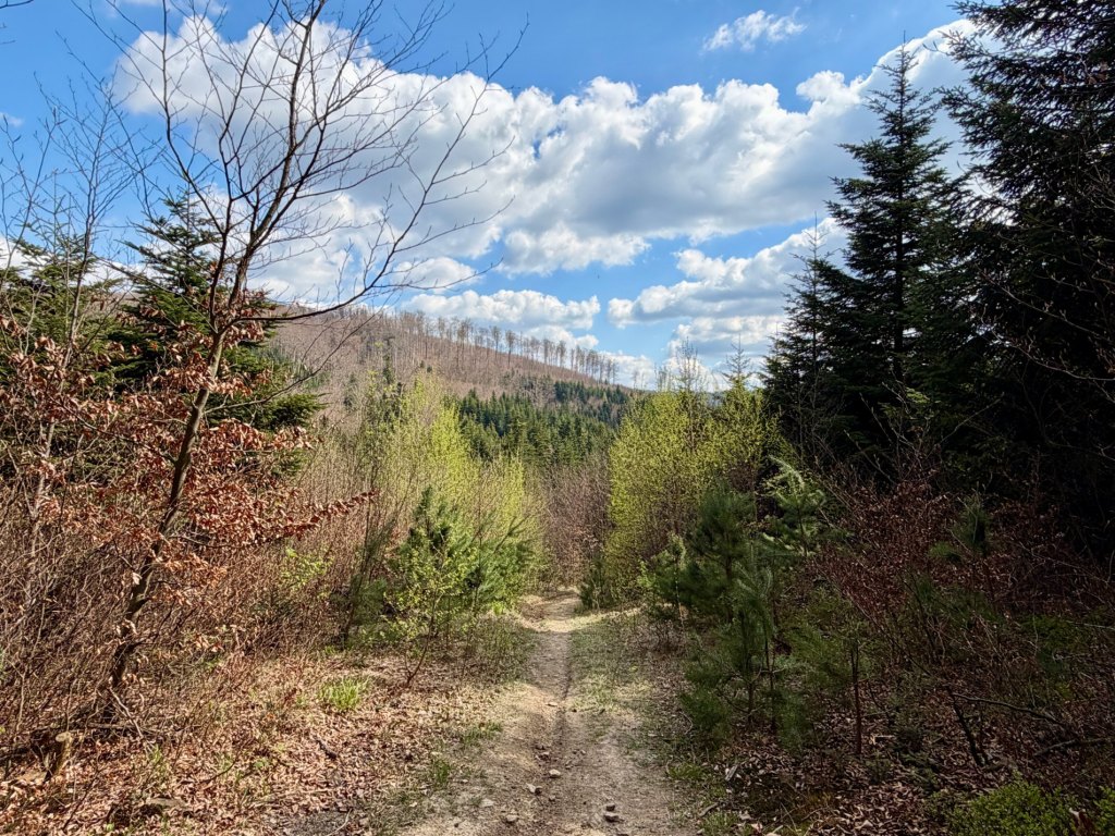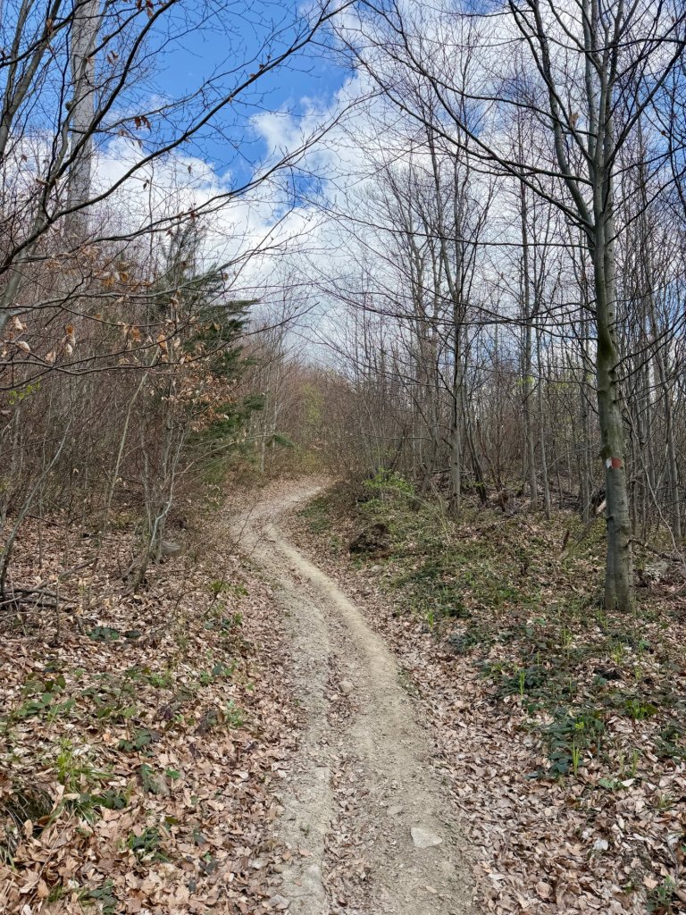 Ścieżka zaczyna się wić, raz schodzimy lekko w dół, zaraz potem podchodzimy, mijamy gdzieś z boku zabudowania wieży retransmisyjnej, ale cały czas trzymamy się oznaczeń. Co jakiś czas wychodzimy na szerszą drogę, teren jest pofałdowany i nie pozostawia miejsca na odpoczynek. I w końcu zaczyna się konkretne podejście, bo to była dopiero rozgrzewka.