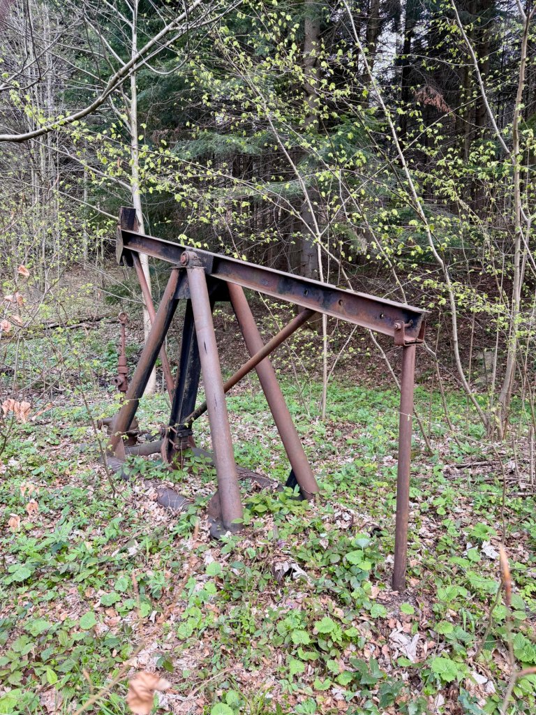 Raz schodzimy, zaraz znowu podchodzimy, potem ścieżka łagodnieje tylko po to, żeby za chwilę znowu zrobić się stroma. W pewnym momencie trafiamy na coś zupełnie nieoczekiwanego, metalową pompę, jak do wydobycia ropy naftowej, stojącą gdzieś w środku lasu. Zatrzymujemy się na chwilę, bardziej z ciekawości niż z chęci odpoczynku, obawiamy się, że jak przysiądziemy na ziemi to ciężko będzie wstać, nogi dają o sobie znać..