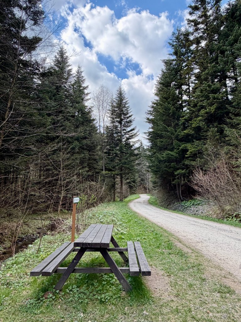 Wychodzimy z lasu i od razu czuć różnicę. Szeroka leśna droga, przyjemny cień, ławki. Obok płynie Czarny Potok, słychać wodę, która szumi w tle i trochę uspokaja po tej bardziej wymagającej części trasy.