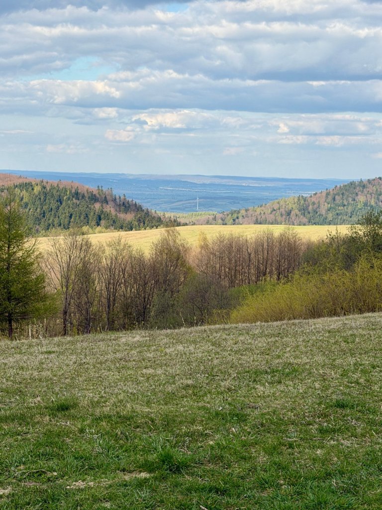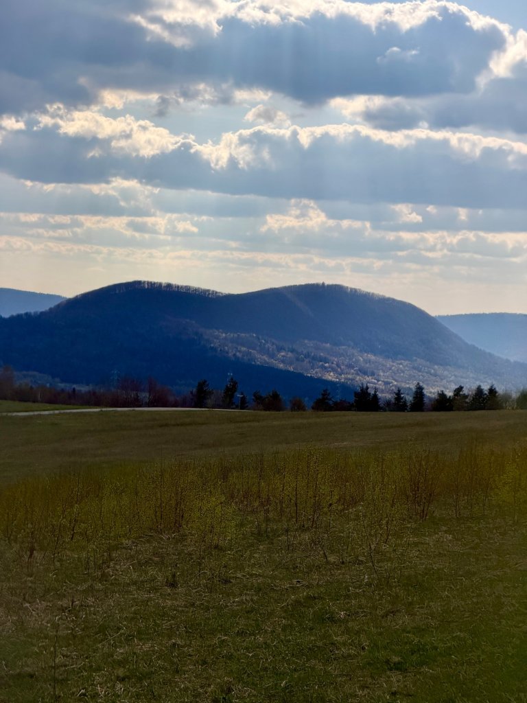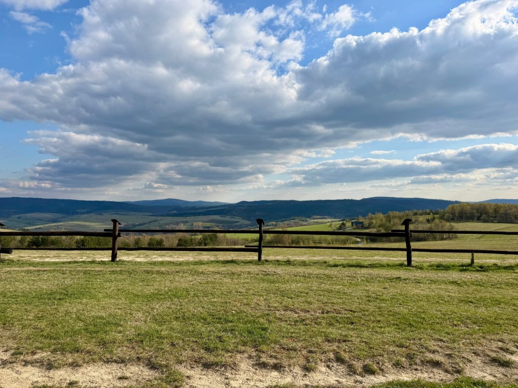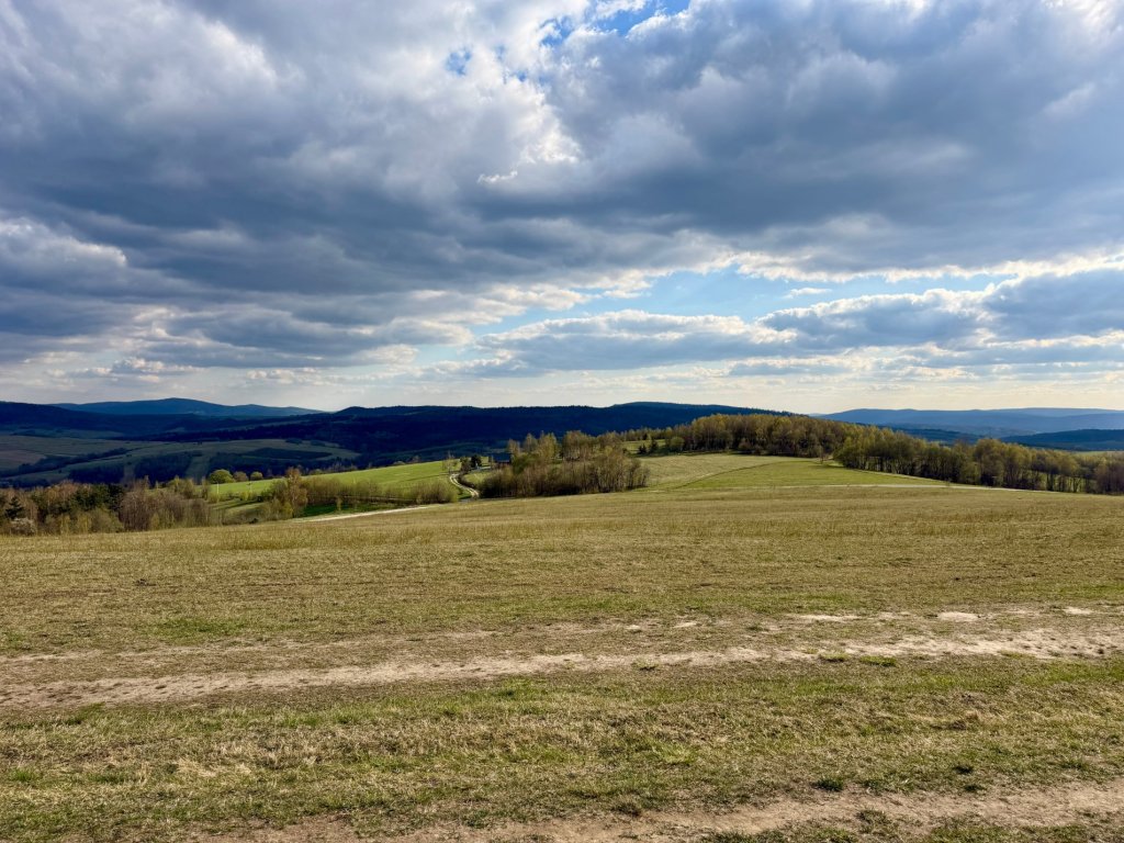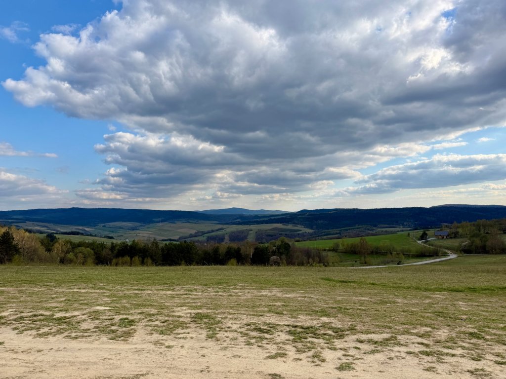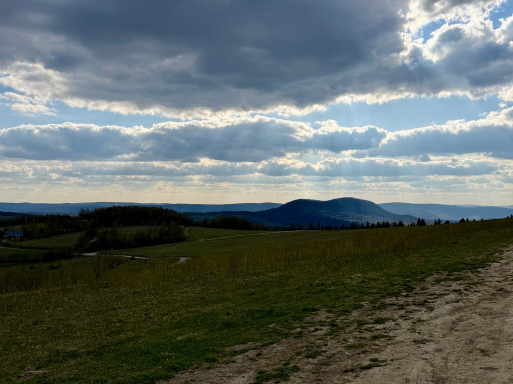 Jedziemy szutrową drogą przez otwartą przestrzeń, łąki, pastwiska, pojedyncze zabudowania. Po obu stronach falujące pagórki i doliny, wszystko jeszcze w tym wczesnowiosennym stanie: trochę zieleni, trochę szarości, drzewa dopiero zaczynają się budzić.